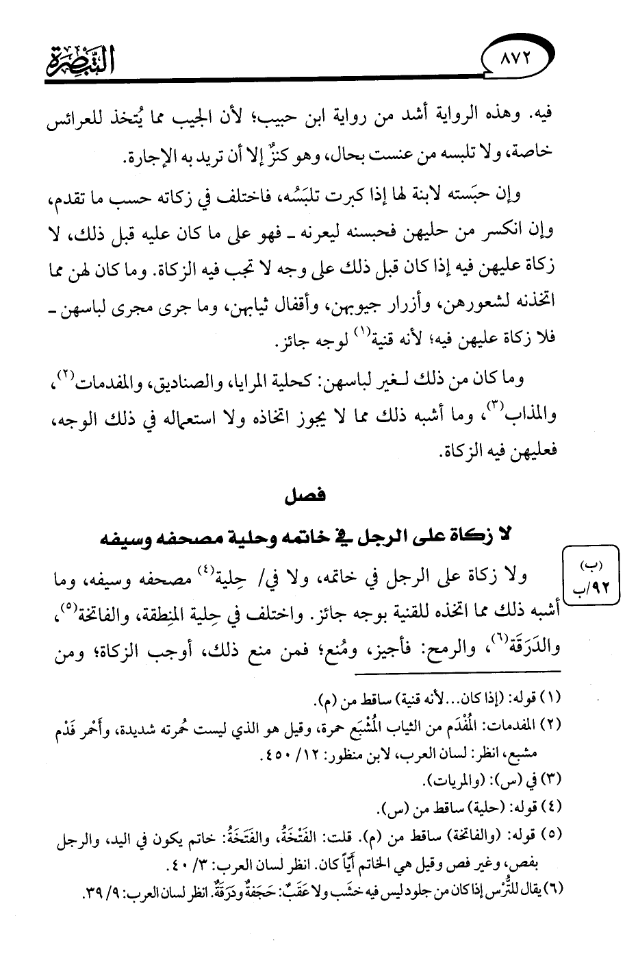 (¬5) قوله: (والفاتخة) ساقط من (م). قلت: الفَتْخَةُ، والفَتَخَةُ: خاتم يكون في اليد، والرجل بفص، وغير فص وقيل هي الخاتم أَيًّا كان. انظر لسان العرب: 3/ 40.