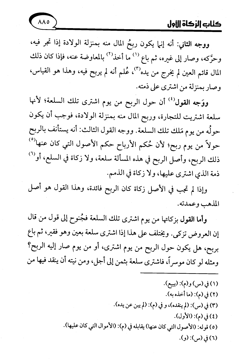 ووَجه القول (¬4) أن حول الربح من يوم اشترى تلك السلعة؛ لأنها سلعة اشتريت للتجارة، وربح المال منه بمنزلة الولادة، فوجب أن يكون حولُه من يوم مَلك تلك السلعة. ووجه القول الثالث: أنه يستأنف بالربح حولًا من يوم ربح؛ لأن حُكم الأرباح حكم الأصول التي كان عنها (¬5) ذلك الربح، وأصل الربح في هذه المسألة سلعة، ولا زكاة في السلع، أو (¬6) ذمة الذي اشترى عليها، ولا زكاة في الذمم.
