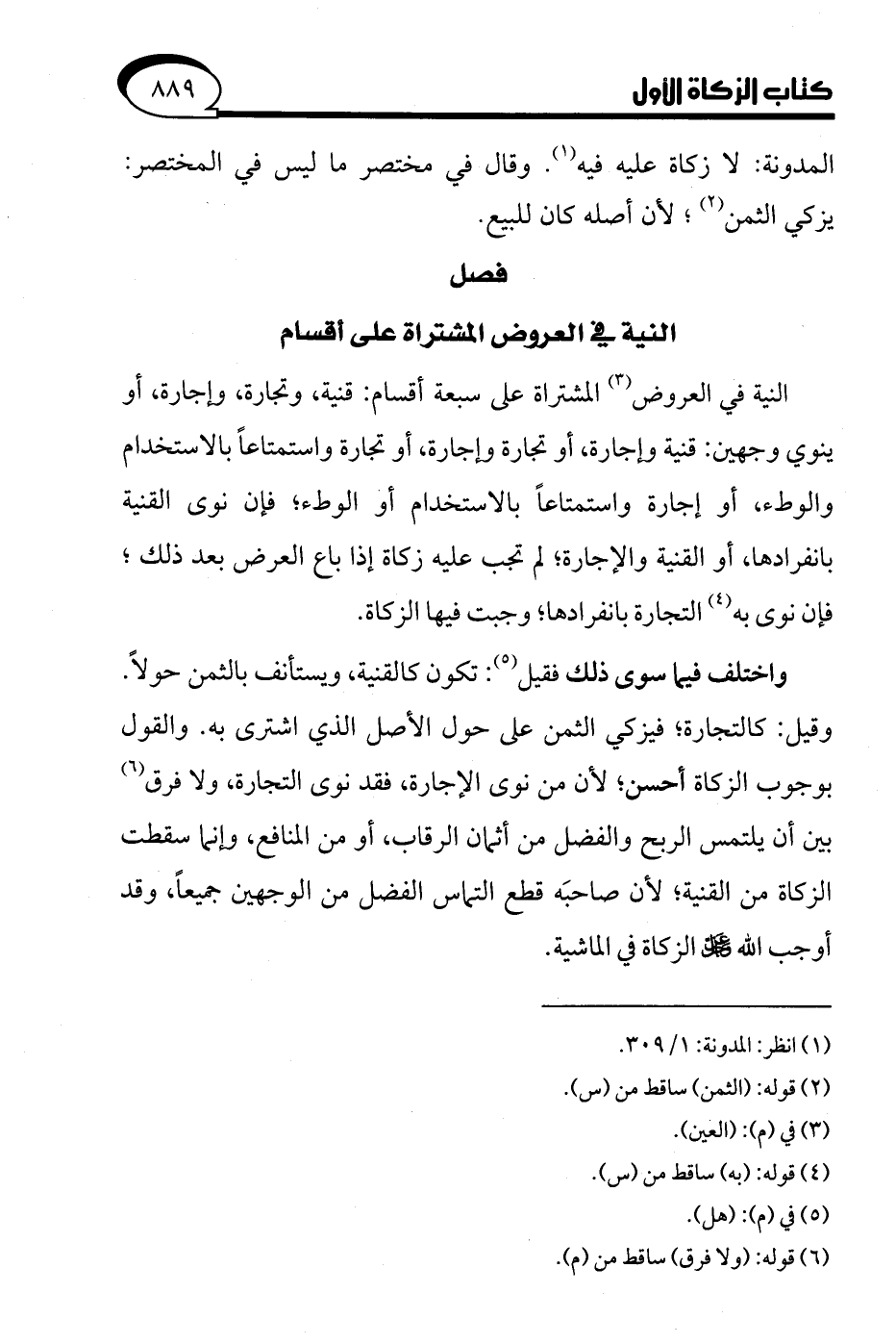 النية في العروض (¬3) المشتراة على سبعة أقسام: قنية، وتجارة، وإجارة، أو ينوي وجهين: قنية وإجارة، أو تجارة وإجارة، أو تجارة واستمتاعًا بالاستخدام والوطء، أو إجارة واستمتاعًا بالاستخدام أو الوطء؛ فإن نوى القنية بانفرادها، أو القنية والإجارة؛ لم تجب عليه زكاة إذا باع العرض بعد ذلك؛ فإن نوى به (¬4) التجارة بانفرادها؛ وجبت فيها الزكاة.