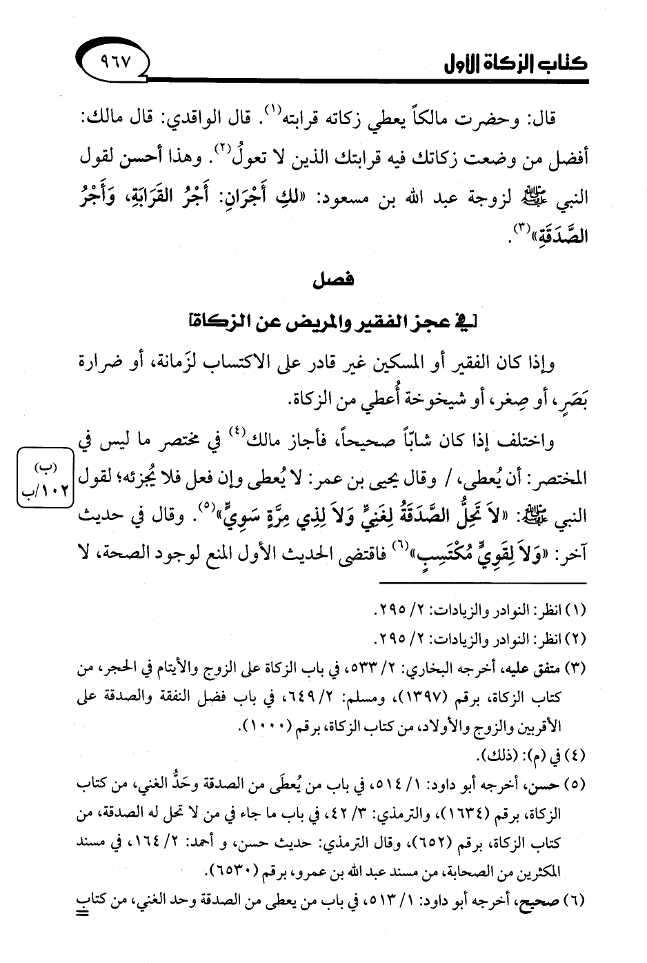 قال: وحضرت مالكًا يعطي زكاته قرابته (¬1). قال الواقدي: قال مالك: أفضل من وضعت زكاتك فيه قرابتك الذين لا تعولُ (¬2). وهذا أحسن لقول النبي - صلى الله عليه وسلم - لزوجة عبد الله بن مسعود: "لكِ أَجْرَانِ: أَجْرُ القَرَابَةِ، وَأَجْرُ الصَّدَقَةِ" (¬3).