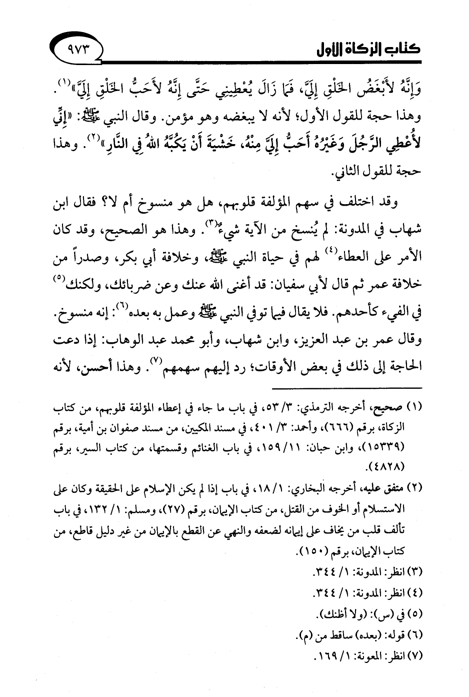 وقد اختلف في سهم المؤلفة قلوبهم، هل هو منسوخ أم لا؟ فقال ابن شهاب في المدونة: لم يُنسخ من الآية شيءٌ (¬3). وهذا هو الصحيح، وقد كان الأمر على العطاء (¬4) لهم في حياة النبي - صلى الله عليه وسلم -، وخلافة أبي بكر، وصدرًا من خلافة عمر ثم قال لأبي سفيان: قد أغنى الله عنك وعن ضربائك، ولكنك (¬5) في الفيء كأحدهم. فلا يقال فيما توفي النبي - صلى الله عليه وسلم - وعمل به بعده (¬6): إنه منسوخ. وقال عمر بن عبد العزيز، وابن شهاب، وأبو محمد عبد الوهاب: إذا دعت الحاجة إلى ذلك في بعض الأوقات؛ رد إليهم سهمهم (¬7). وهذا أحسن؛ لأنه