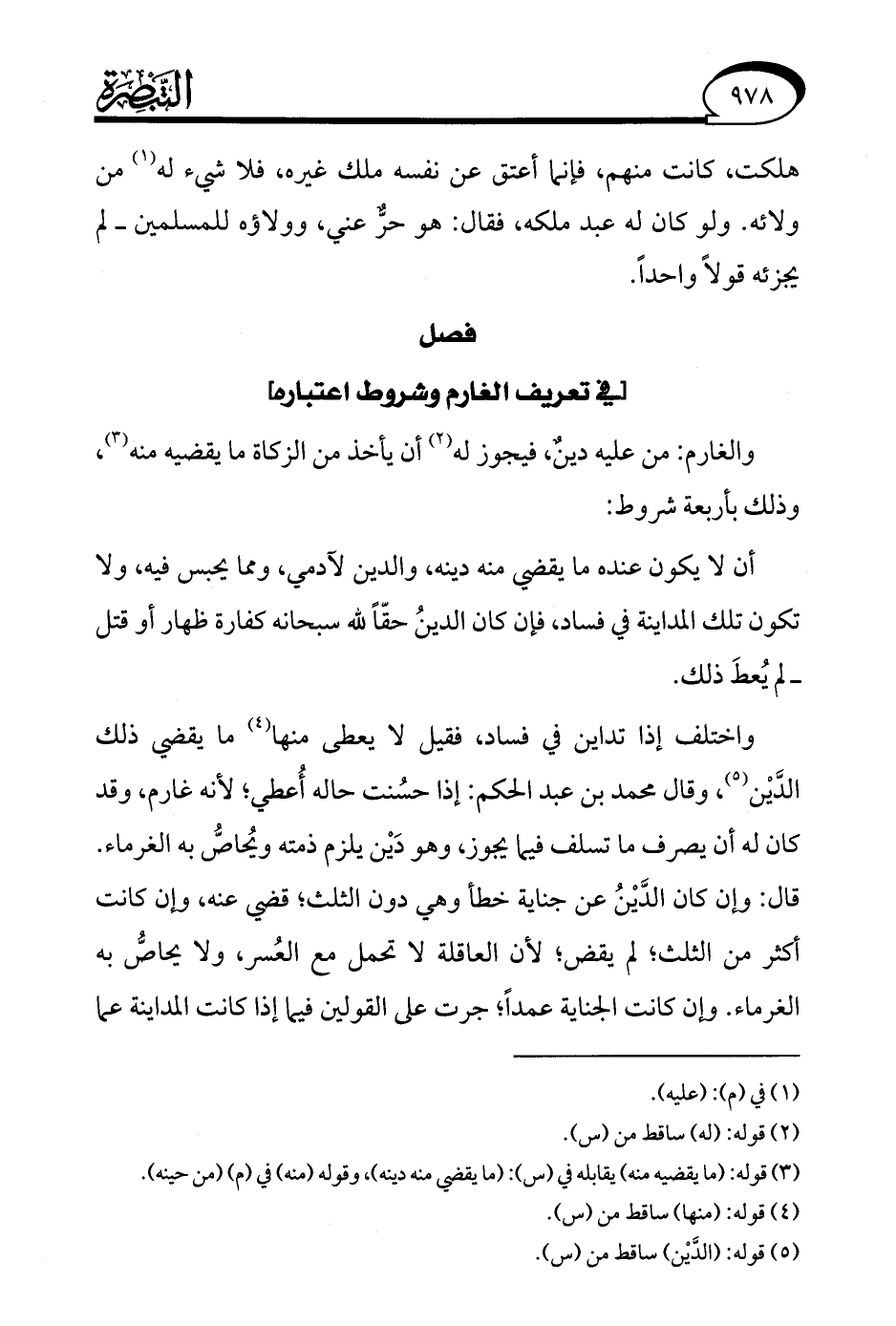 واختلف إذا تداين في فساد، فقيل لا يعطى منها (¬4) ما يقضي ذلك الدَّيْن (¬5)، وقال محمد بن عبد الحكم: إذا حسُنت حاله أُعطي؛ لأنه غارم، وقد كان له أن يصرف ما تسلف فيما يجوز، وهو دَيْن يلزم ذمته ويُحاصُّ به الغرماء. قال: وإن كان الدَّيْنُ عن جناية خطأ وهي دون الثلث؛ قضي عنه، وإن كانت أكثر من الثلث؛ لم يقض؛ لأن العاقلة لا تحمل مع العُسر، ولا يحاصُّ به