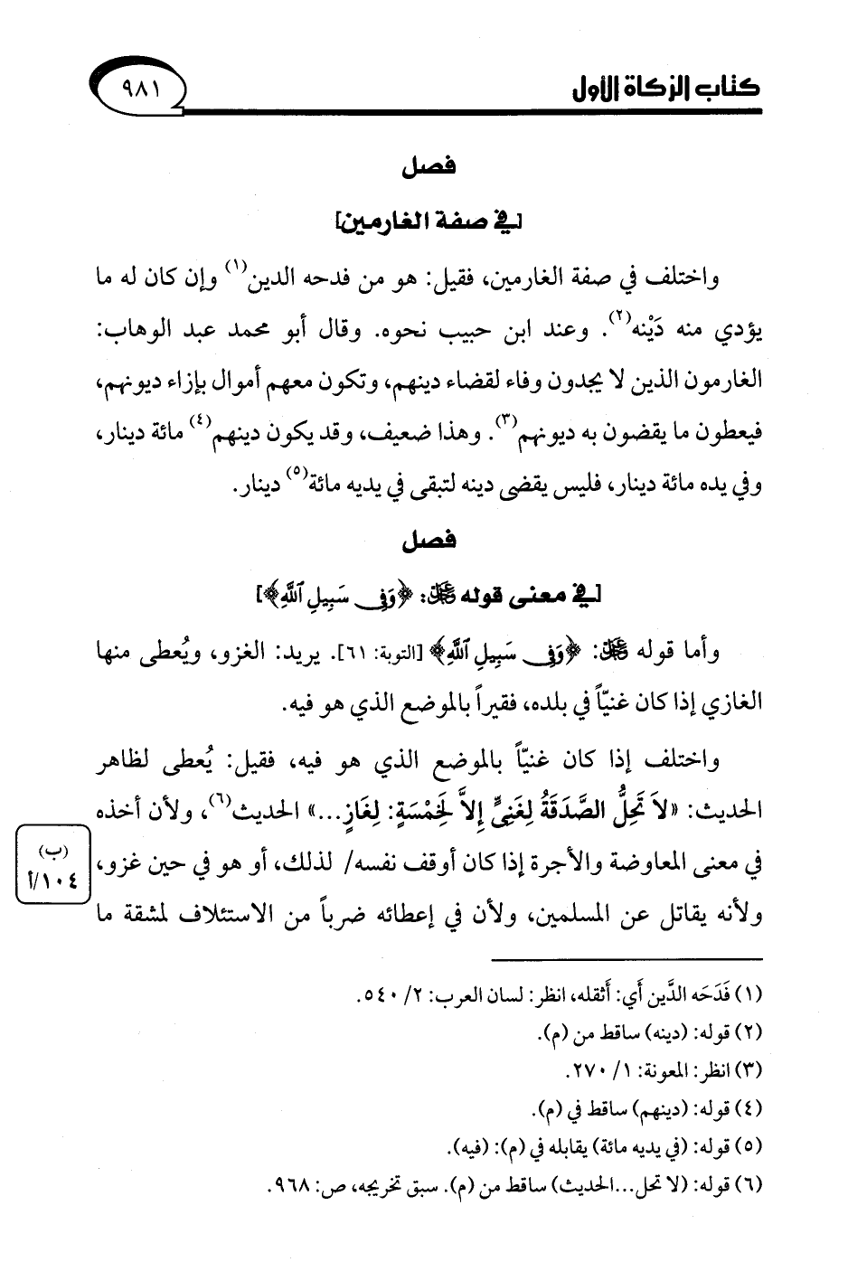 وأما قوله -عز وجل-: {وَفِي سَبِيلِ اللَّهِ} [التوبة: 60]. يريد: الغزو، ويُعطى منها الغازي إذا كان غنيًّا في بلده، فقيرًا بالموضع الذي هو فيه.