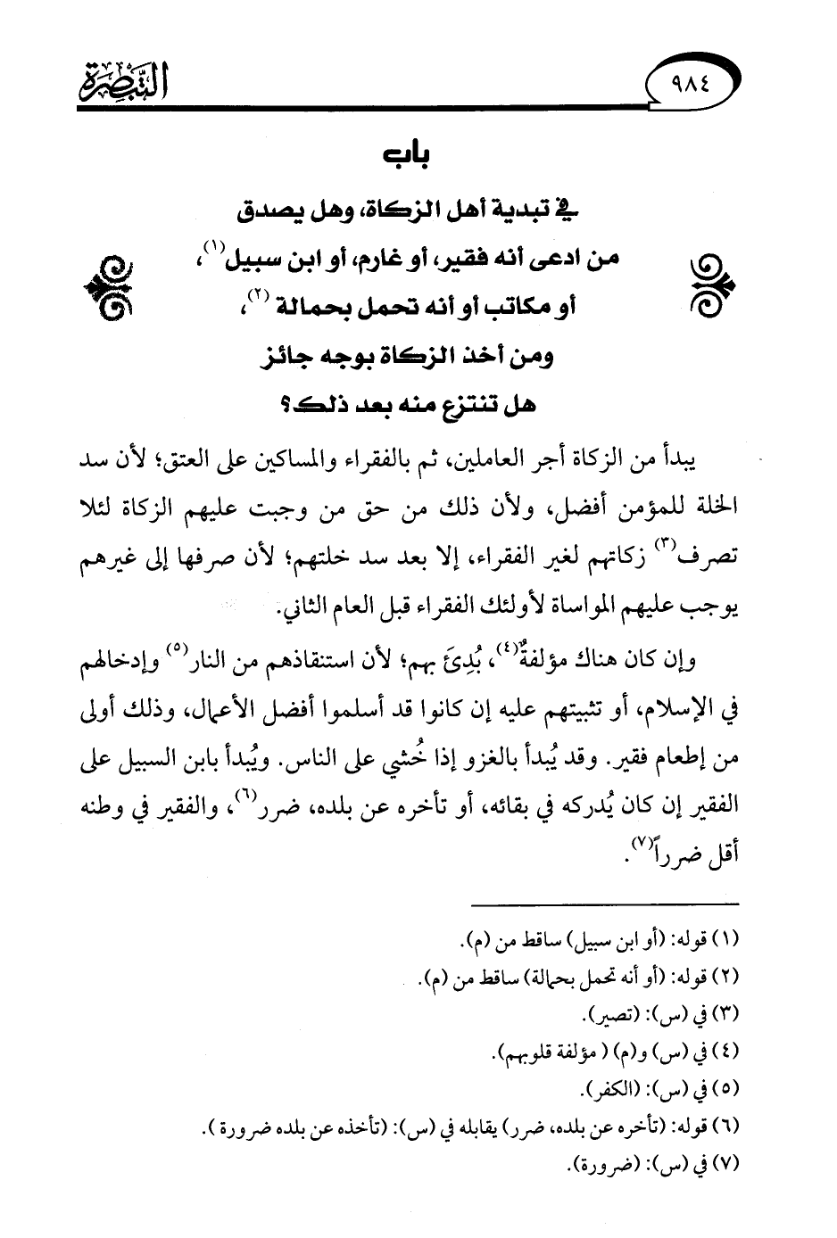 وإن كان هناك مؤلفةٌ (¬4)، بُدِئَ بهم؛ لأن استنقاذهم من النار (¬5) وإدخالهم في الإسلام، أو تثبيتهم عليه إن كانوا قد أسلموا أفضل الأعمال، وذلك أولى من إطعام فقير. وقد يُبدأ بالغزو إذا خُشي على الناس. ويُبدأ بابن السبيل على الفقير إن كان يُدركه في بقائه، أو تأخره عن بلده، ضرر (¬6)، والفقير في وطنه أقل ضررًا (¬7).