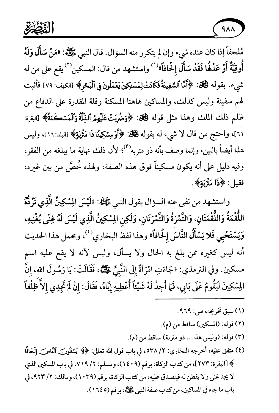 (¬4) متفق عليه أخرجه البخاري: 2/ 538، في باب قول الله تعالى: {لَا يَسْأَلُونَ النَّاسَ إِلْحَافًا} [البقرة: 273]، من كتاب الزكاة، برقم (1409)، ومسلم: 2/ 719، في باب المسكين الذي لا يجد غنى ولا يفطن له فيتصدق عليه، من كتاب الزكاة، برقم (1039)، ومالك: 2/ 923، في باب ما جاء في المساكين، من كتاب صفة النبي - صلى الله عليه وسلم - برقم (1645).