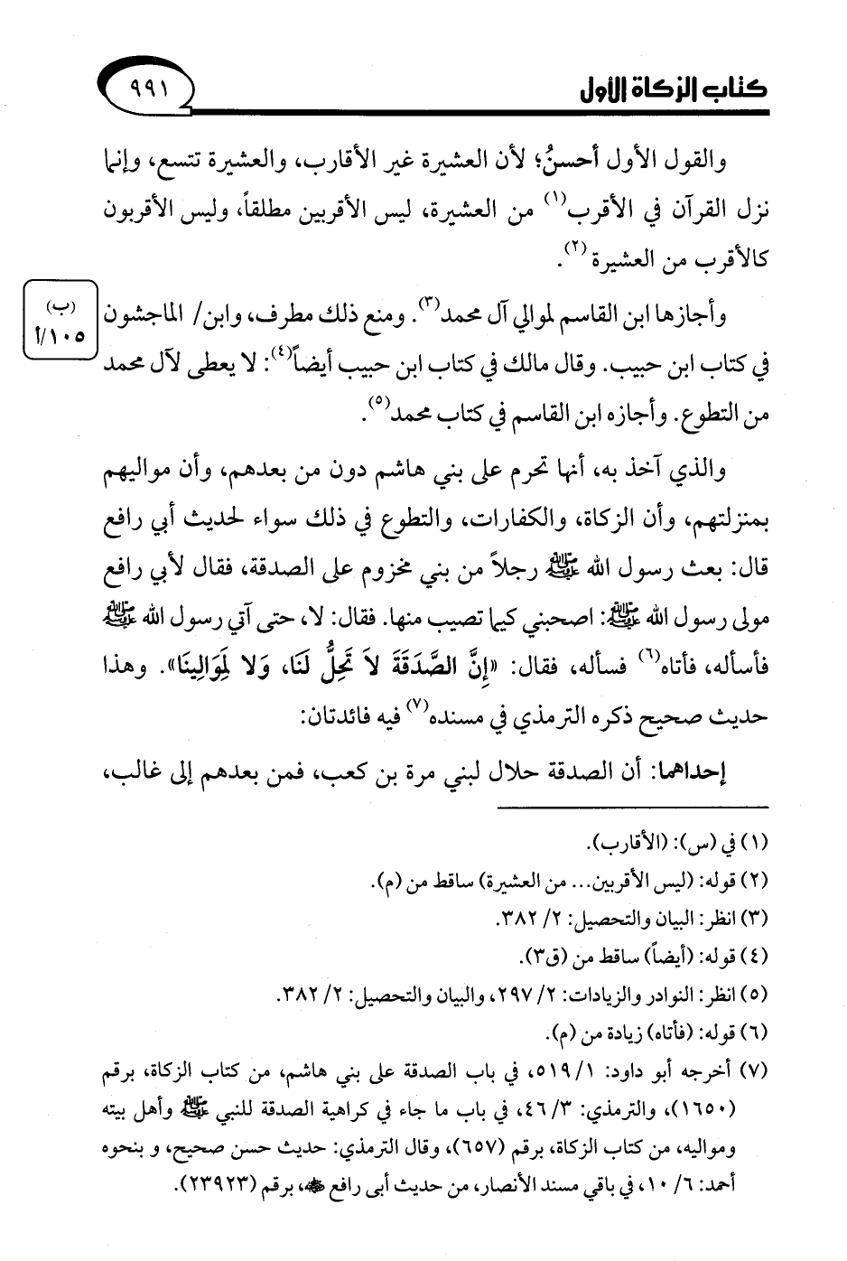 (¬7) أخرجه أبو داود: 1/ 519، في باب الصدقة على بني هاشم، من كتاب الزكاة، برقم (1650)، والترمذي: 3/ 46، في باب ما جاء في كراهية الصدقة للنبي - صلى الله عليه وسلم - وأهل بيته ومواليه، من كتاب الزكاة، برقم (657)، وقال الترمذي: حديث حسن صحيح، وبنحوه أحمد: 6/ 10، في باقي مسند الأنصار، من حديث أبى رافع - رضي الله عنه -، برقم (23923).