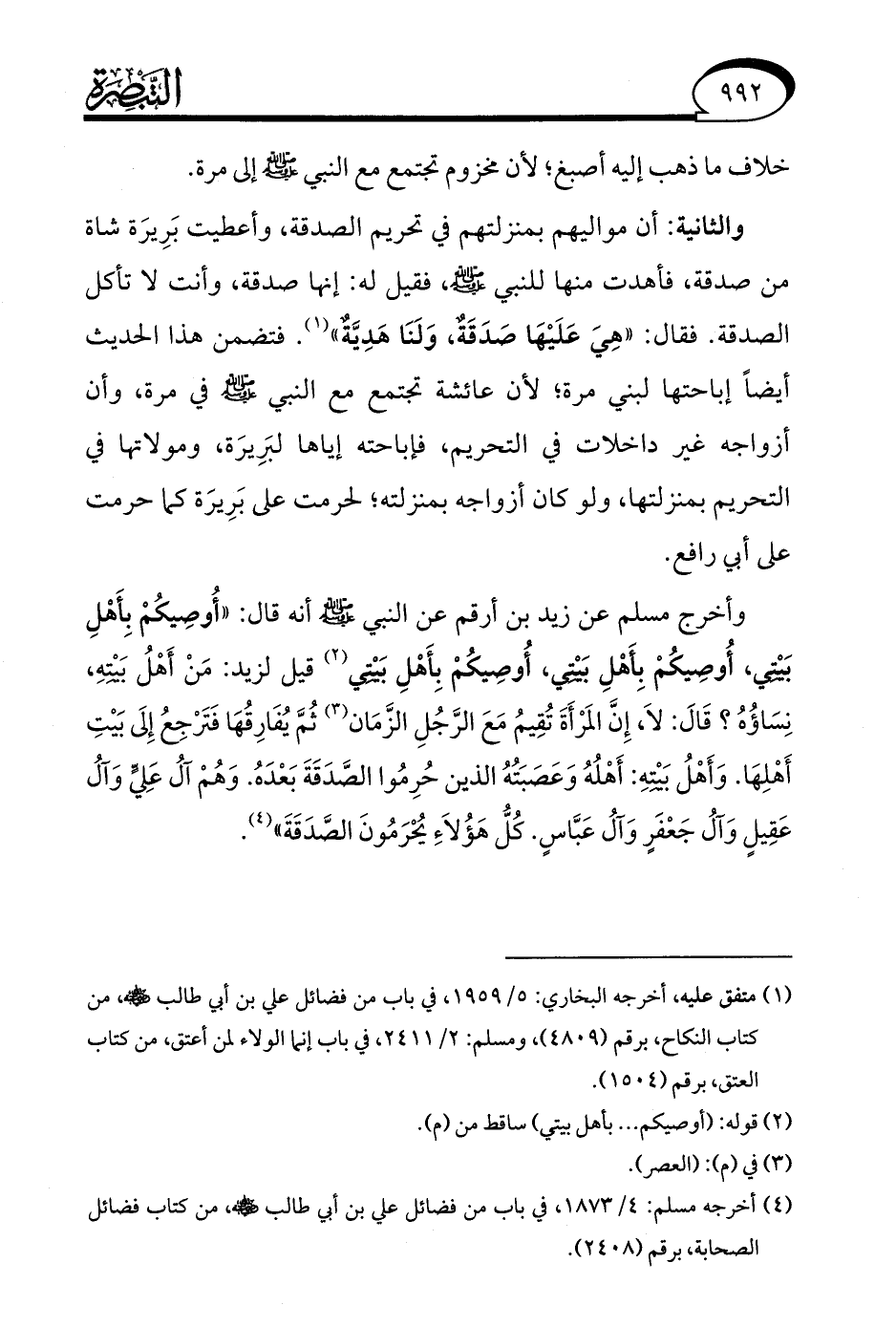 وأخرج مسلم عن زيد بن أرقم عن النبي - صلى الله عليه وسلم - أنه قال: "أُوصِيكُمْ بِأَهْلِ بَيْتِي، أُوصِيكُمْ بِأَهْلِ بَيْتِي، أُوصِيكُمْ بِأَهْلِ بَيْتِي (¬2) قيل لزيد: مَنْ أَهْلُ بَيْتِهِ، نِسَاؤُهُ؟ قَالَ: لاَ، إِنَّ المَرْأَةَ تُقِيمُ مَعَ الرَّجُلِ الزَّمَان (¬3) ثُمَّ يُفَارِقُهَا فَتَرْجِعُ إِلَى بَيْتِ أَهْلِهَا. وَأَهْلُ بَيْتِهِ: أَهْلُهُ وَعَصَبَتُهُ الذين حُرِمُوا الصَّدَقَةَ بَعْدَهُ. وَهُمْ آلُ عَلِيٍّ وَآلُ عَقِيلٍ وَآلُ جَعْفَرٍ وَآلُ عَبَّاسٍ. كُلُّ هَؤُلاَءِ يُحْرَمُونَ الصَّدَقَةَ" (¬4).