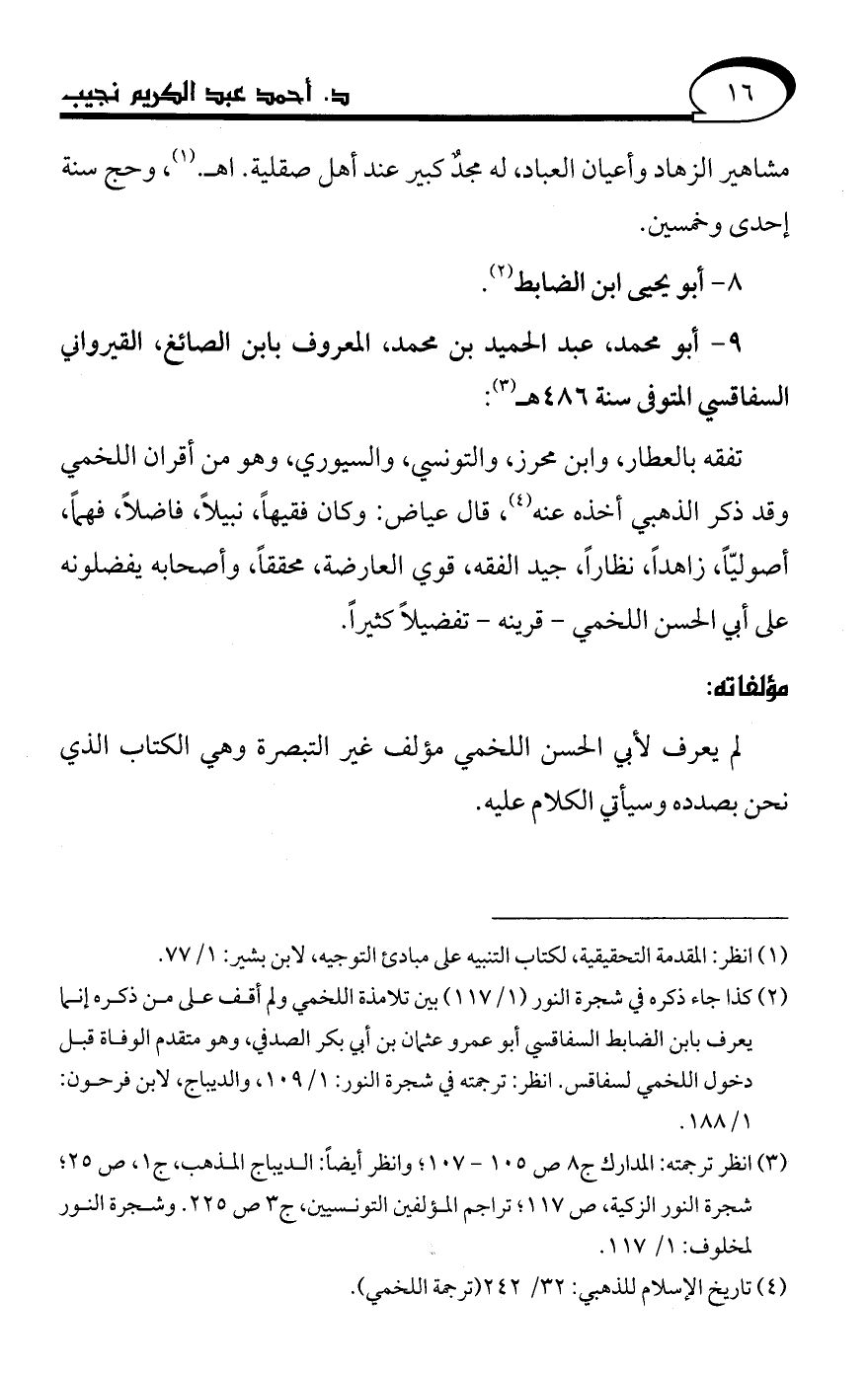 (¬2) كذا جاء ذكره في شجرة النور (1/ 117) بين تلامذة اللخمي ولم أقف على من ذكره إنما يعرف بابن الضابط السفاقسي أبو عمرو عثمان بن أبي بكر الصدفي، وهو متفدم الوفاة قبل دخول اللخمي لسفاقس. انظر: ترجمته في شجرة النور: 1/ 109، والديباج، لابن فرحون: 1/ 188.