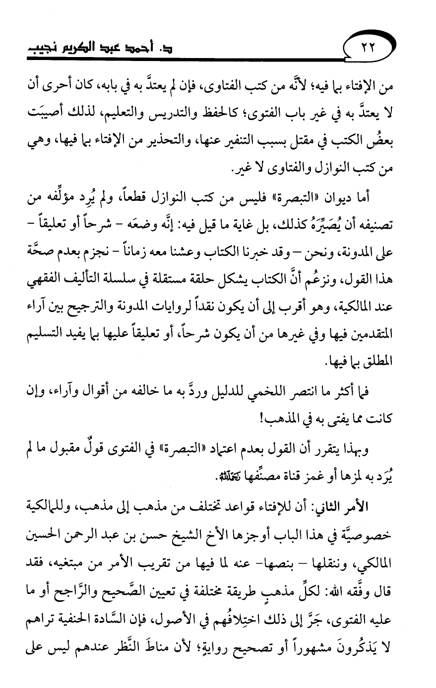 من الإفتاء بما فيه؛ لأنَّه من كتب الفتاوى، فإن لم يعتدَّ به في بابه، كان أحرى أن لا يعتدَّ به في غير باب الفتوى؛ كالحفظ والتدريس والتعليم، لذلك أصيبَت بعضُ الكتب في مقتل بسبب التنفير عنها، والتحذير من الإفتاء بما فيها، وهي من كتب النوازل والفتاوى لا غير.