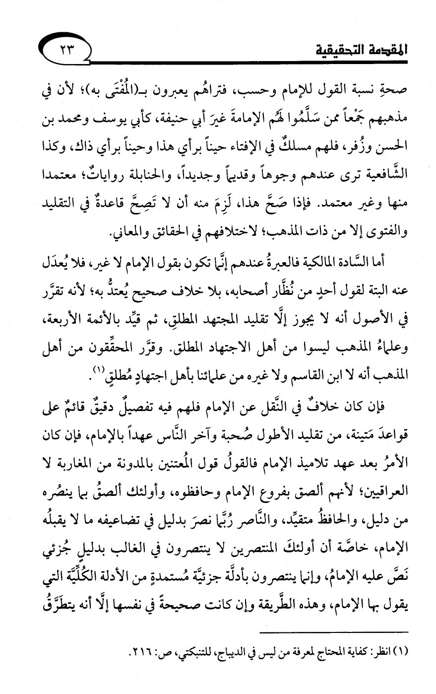 أما السَّادة المالكية فالعبرةُ عندهم إنَّما تكون بقول الإمام لا غير، فلا يُعدَل عنه البتة لقول أحدٍ من نُظَّار أصحابه، بلا خلاف صحيح يُعتدُّ به؛ لأنه تقرَّر في الأصول أنه لا يجوز إلَّا تقليد المجتهد المطلقِ، ثم قيِّد بالأئمة الأربعة، وعلماءُ المذهب ليسوا من أهل الاجتهاد المطلق. وقرَّر المحقِّقون من أهل المذهب أنه لا ابن القاسم ولا غيره من علمائنا بأهل اجتهادٍ مُطلقٍ (¬1).