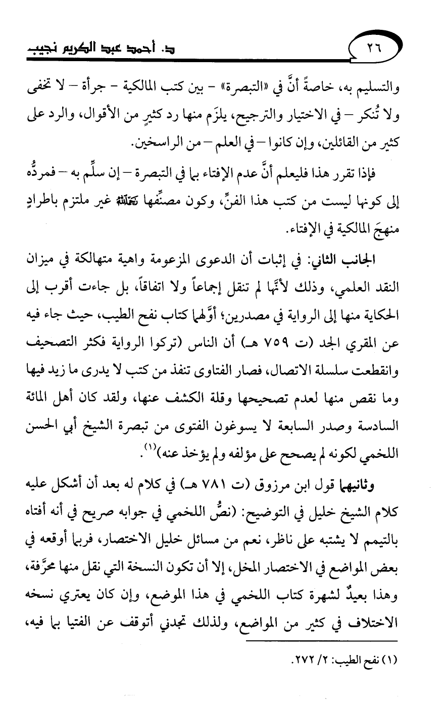 والتسليم به، خاصةً أنَّ في "التبصرة" -بين كتب المالكية- جرأة -لا تخفى ولا تُنكر- في الاختيار والترجيح، يلزَم منها رد كثيرٍ من الأقوال، والرد على كثير من القائلين، وإن كانوا -في العلم- من الراسخين.