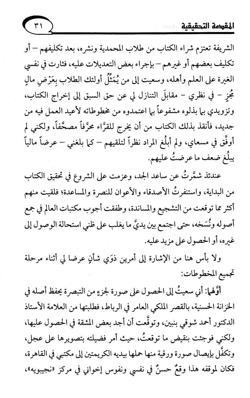 الشريفة تعتزم شراء الكتاب من طلاب المحمدية ونشره، بعد تكليفهم -أو تكليف بعضهم أو غيرهم- بإجراء بعض التعديلات عليه، فثارت في نفسي الغيرة على العلم وأهله، وسعيت إلى -من يُمَثِّلُ أولئك الطلاب بِعَرْضِ مالٍ مجُزٍ- في نظري -مقابلَ التنازل لي عن حق السبق إلى إخراج الكتاب، وتزويدي بما بذلوه مشفوعًا بما اعتمدوه من مخطوطاته لأعيد العمل فيه من