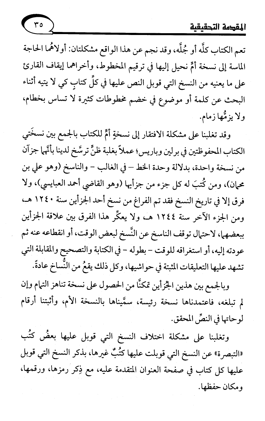 تعم الكتاب كلَّه أو جُلَّه، وقد نجم عن هذا الواقع مشكلتان: أولاهُما الحاجة الماسة إلى نسخة أمٍّ نحيل إليها في ترقيم المخطوط، وأخراهما إيقاف القارئ على ما يعنيه من النسخ التي قوبل النص عليها في كلِّ كتابٍ كي لا يتيه أثناء البحث عن كلمة أو موضوع في خضم مخطوطات كثيرة لا تساس بخطام، ولا يزمُّها زمام.