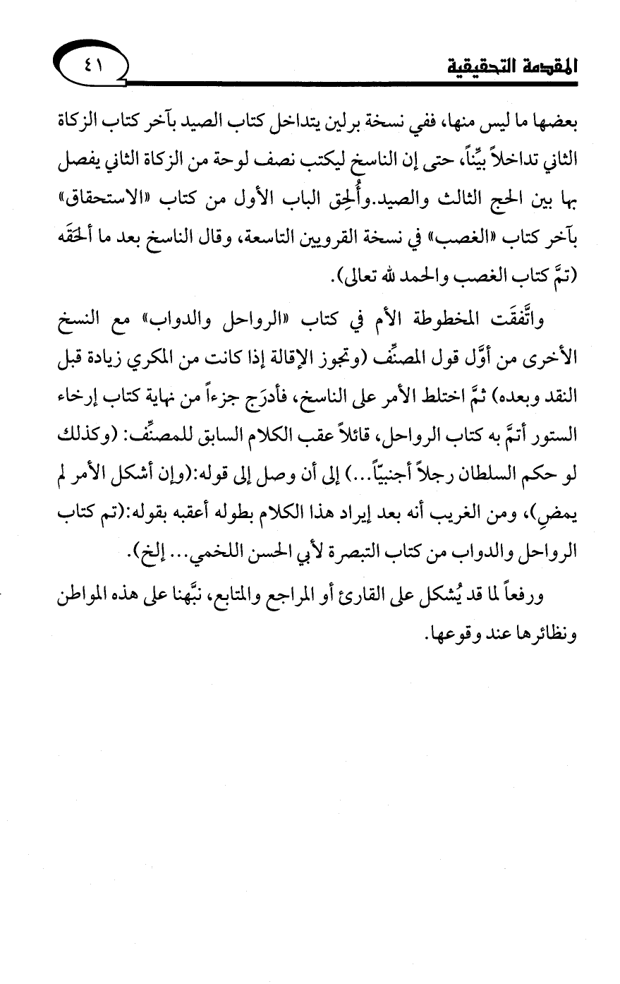 واتَّفقَت المخطوطة الأم في كتاب "الرواحل والدواب" مع النسخ الأخرى من أوَّل قول المصنِّف (وتجوز الإقالة إذا كانت من المكري زيادة قبل النقد وبعده) ثمَّ اختلط الأمر على الناسخ، فأدرَج جزءًا من نهاية كتاب إرخاء الستور أتمَّ به كتاب الرواحل، قائلًا عقب الكلام السابق للمصنِّف: (وكذلك لو حكم السلطان رجلًا أجنبيًّا. . .) إلى أن وصل إلى قوله: (وإن أشكل الأمر لم يمضِ)، ومن الغريب أنه بعد إيراد هذا الكلام بطوله أعقبه بقوله: (تم كتاب الرواحل والدواب من كتاب التبصرة لأبي الحسن اللخمي. . . إلخ).