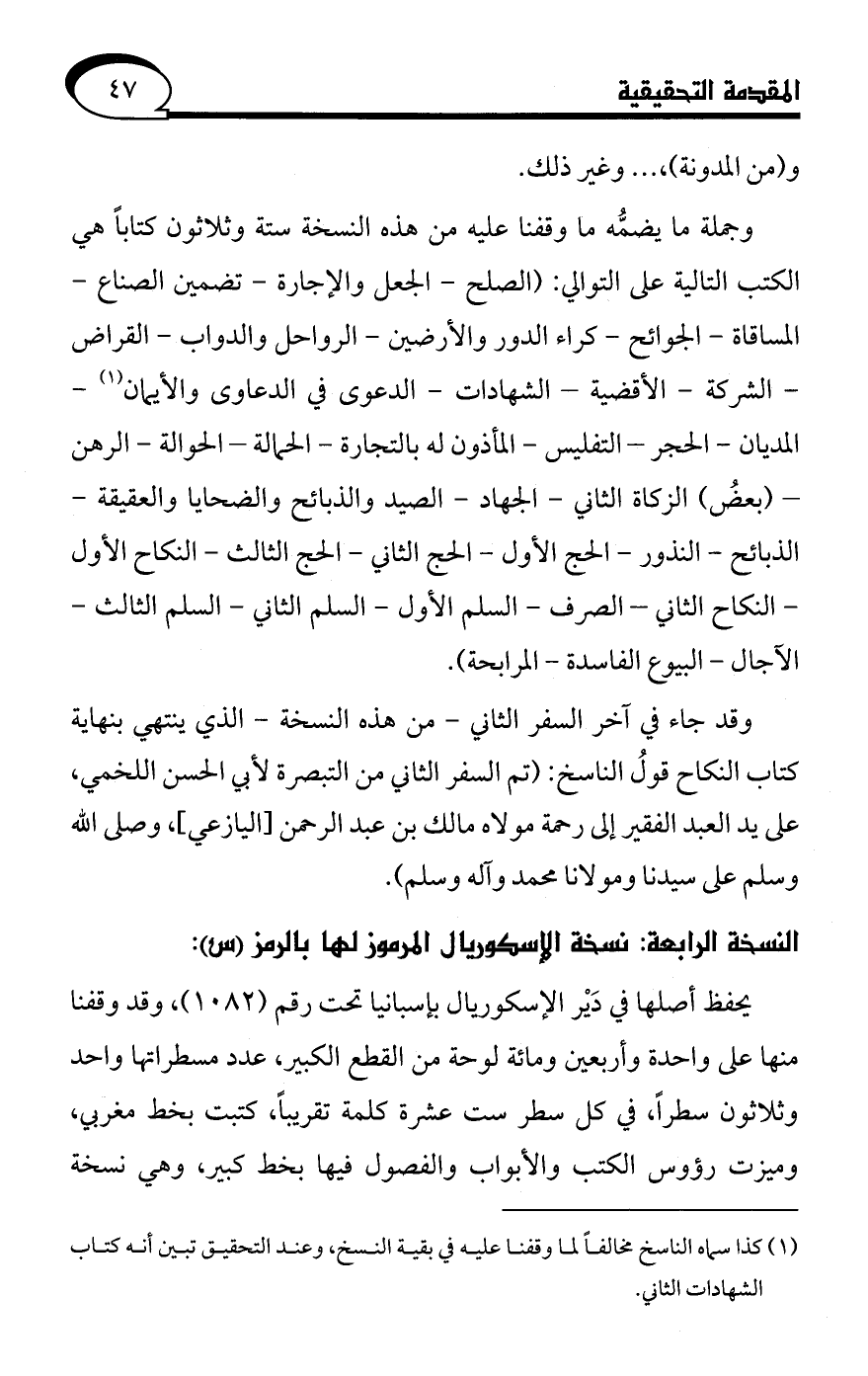 وجملة ما يضمُّه ما وقفنا عليه من هذه النسخة ستة وثلاثون كتابًا هي الكتب التالية على التوالي: (الصلح - الجعل والإجارة - تضمين الصناع - المساقاة - الجوائح - كراء الدور والأرضين - الرواحل والدواب - القراض - الشركة - الأقضية - الشهادات - الدعوى في الدعاوى والأيمان (¬1) - المديان - الحجر - التفليس - المأذون له بالتجارة - الحمالة - الحوالة - الرهن - (بعضُ) الزكاة الثاني - الجهاد - الصيد والذبائح والضحايا والعقيقة - الذبائح - النذور - الحج الأول - الحج الثاني - الحج الثالث - النكاح الأول - النكاح الثاني- الصرف - السلم الأول- السلم الثاني - السلم الثالث - الآجال - البيوع الفاسدة - المرابحة).