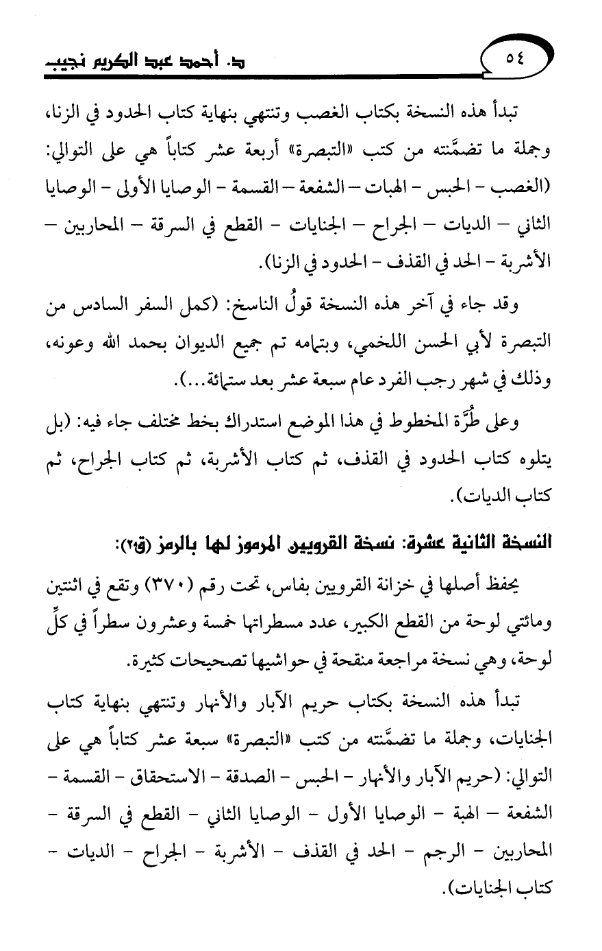 وعلى طُرَّة المخطوط في هذا الموضع استدراك بخط مختلف جاء فيه: (بل يتلوه كتاب الحدود في القذف، ثم كتاب الأشربة، ثم كتاب الجراح، ثم كتاب الديات).