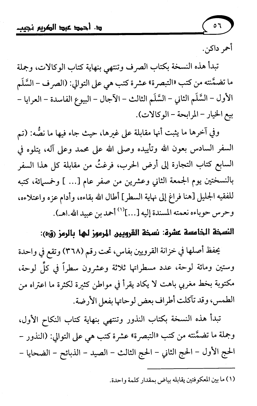 وفي آخرها ما يثبت أنها مقابلة على غيرها، حيث جاء فيها ما نصَّه: (تم السفر السادس بعون الله وتأييده وصلى الله على محمد وعلى آله، يتلوه في السابع كتاب التجارة إلى أرض الحرب، فرغتُ من مقابلة كل هذا السفر بالنسختين يوم الجمعة الثاني وعشرين من صفر عام [. . .] وخمسمائة، كتبه للفقيه الجليل [هنا فراغ إلى نهاية السطر] أطال الله بقاءه، وأدام عزه واعتلاءه، وحرس حوباءه نعمته المسندة إليه [. . .] (¬1) أحمد بن عبيد الله. اهـ).