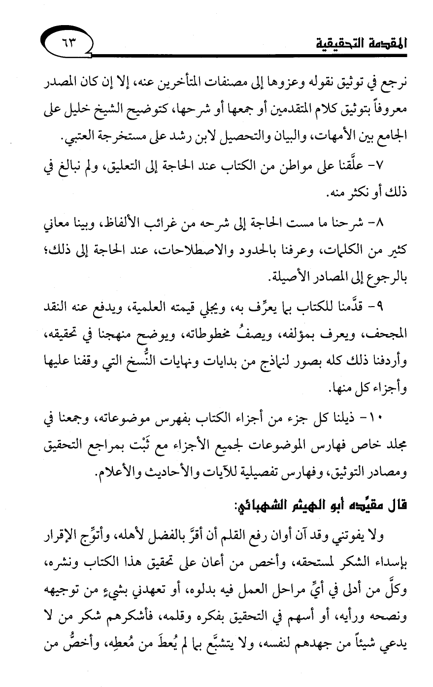 ولا يفوتني وقد آن أوان رفع القلم أن أقرَّ بالفضل لأهله، وأتوِّج الإقرار بإسداء الشكو لمستحقه، وأخص من أعان على تحقيق هذا الكتاب ونشره، وكلَّ من أدلى في أيِّ مراحل العمل فيه بدلوه، أو تعهدني بشيءٍ من توجيهه ونصحه ورأيه، أو أسهم في التحقيق بفكره وقلمه، فأشكرهم شكر من لا يدعي شيئًا من جهدهم لنفسه، ولا يتشبَّع بما لم يُعطَ من مُعطِه، وأخصُّ من