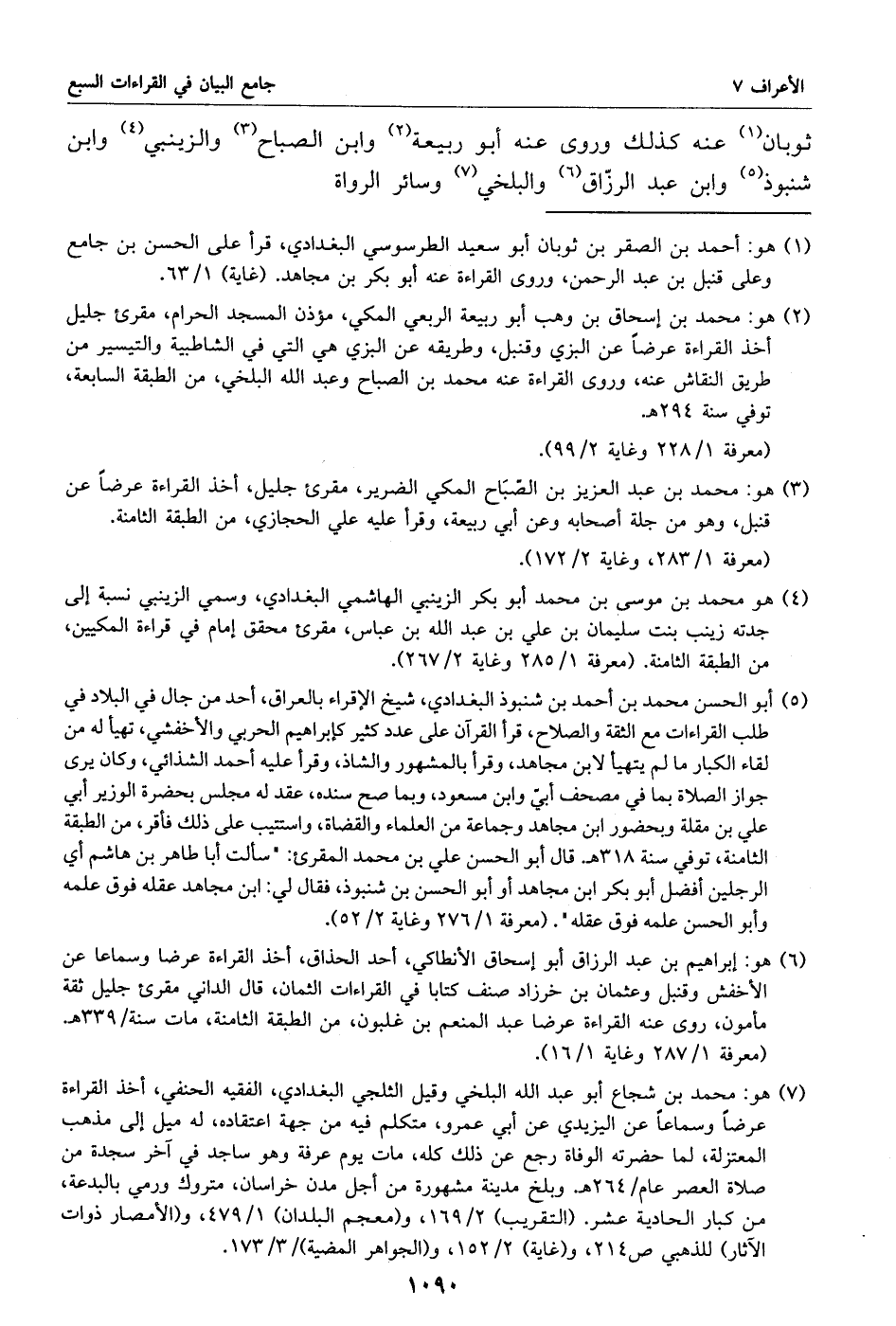 (7) هو: محمد بن شجاع أبو عبد الله البلخي وقيل الثلجي البغدادي، الفقيه الحنفي، أخذ القراءة عرضا وسماعا عن اليزيدي عن أبي عمرو، متكلم فيه من جهة اعتقاده، له ميل إلى مذهب المعتزلة، لما حضرته الوفاة رجع عن ذلك كله، مات يوم عرفة وهو ساجد في آخر سجدة من صلاة العصر عام/ 264 هـ. وبلخ مدينة مشهورة من أجل مدن خراسان، متروك ورمي بالبدعة، من كبار الحادية عشر. (التقريب) 2/ 169، و (معجم البلدان) 1/ 479، و (الأمصار ذوات الآثار) للذهبي ص 214، و (غاية) 2/ 152، و (الجواهر المضية) 3/ 173.