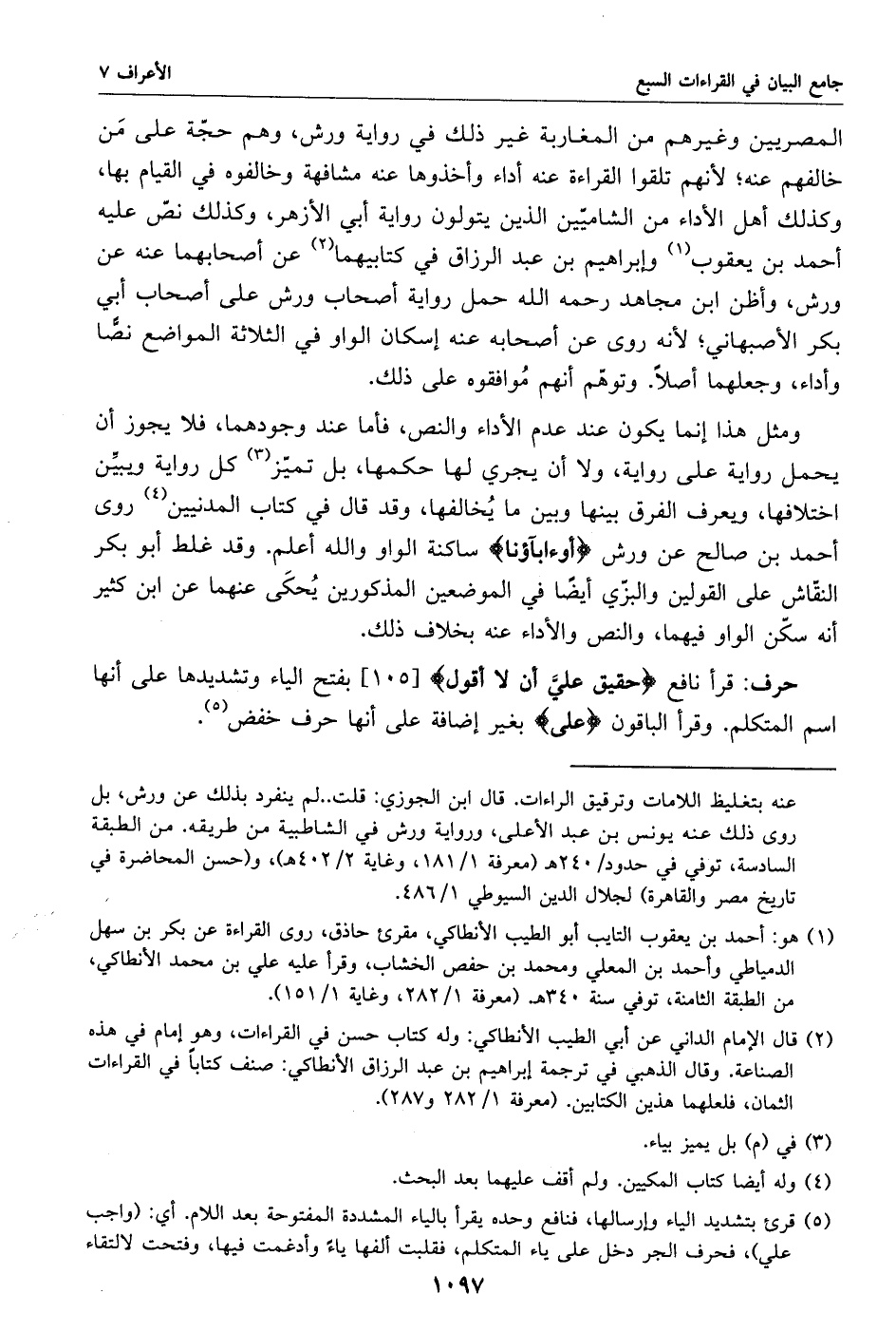 عنه بتغليظ اللامات وترقيق الراءات. قال ابن الجوزي: قلت .. لم ينفرد بذلك عن ورش، بل روى ذلك عنه يونس بن عبد الأعلى، ورواية ورش في الشاطبية من طريقه. من الطبقة السادسة، توفي في حدود/ 240 هـ (معرفة 1/ 181، وغاية 2/ 402 هـ)، و (حسن المحاضرة في تاريخ مصر والقاهرة) لجلال الدين السيوطي 1/ 486.