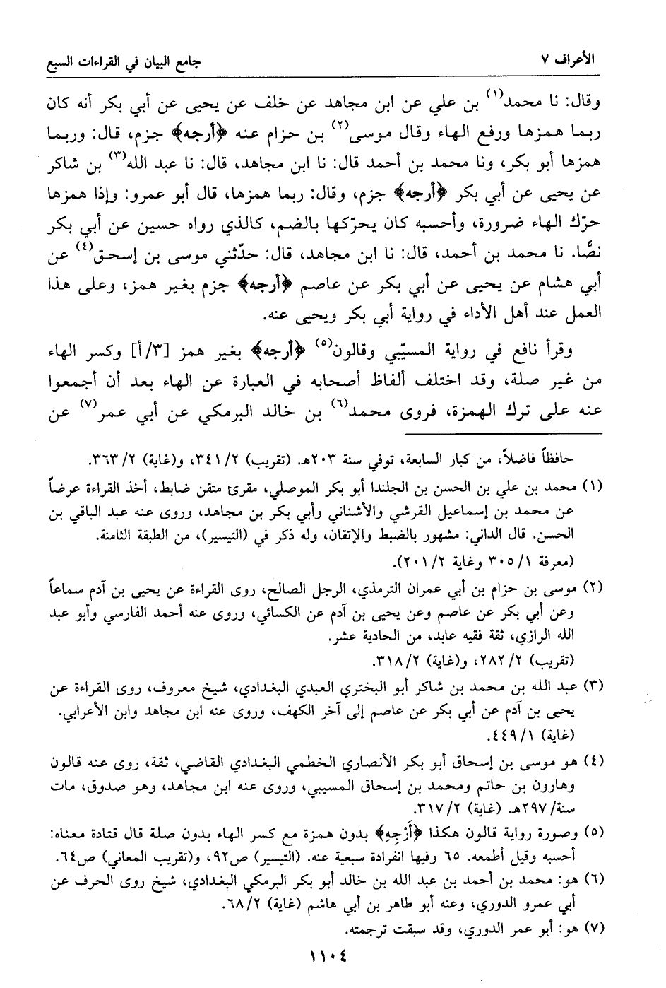 وقال: نا محمد «1» بن علي عن ابن مجاهد عن خلف عن يحيى عن أبي بكر أنه كان ربما همزها ورفع الهاء وقال موسى «2» بن حزام عنه أرجه جزم، قال: وربما همزها أبو بكر، ونا محمد بن أحمد قال: نا ابن مجاهد، قال: نا عبد الله «3» بن شاكر عن يحيى عن أبي بكر أرجه جزم، وقال: ربما همزها، قال أبو عمرو: وإذا همزها حرّك الهاء ضرورة، وأحسبه كان يحرّكها بالضم، كالذي رواه حسين عن أبي بكر نصّا. نا محمد بن أحمد، قال: نا ابن مجاهد، قال: حدّثني موسى بن إسحاق «4» عن أبي هشام عن يحيى عن أبي بكر عن عاصم أرجه جزم بغير همز، وعلى هذا العمل عند أهل الأداء في رواية أبي بكر ويحيى عنه.