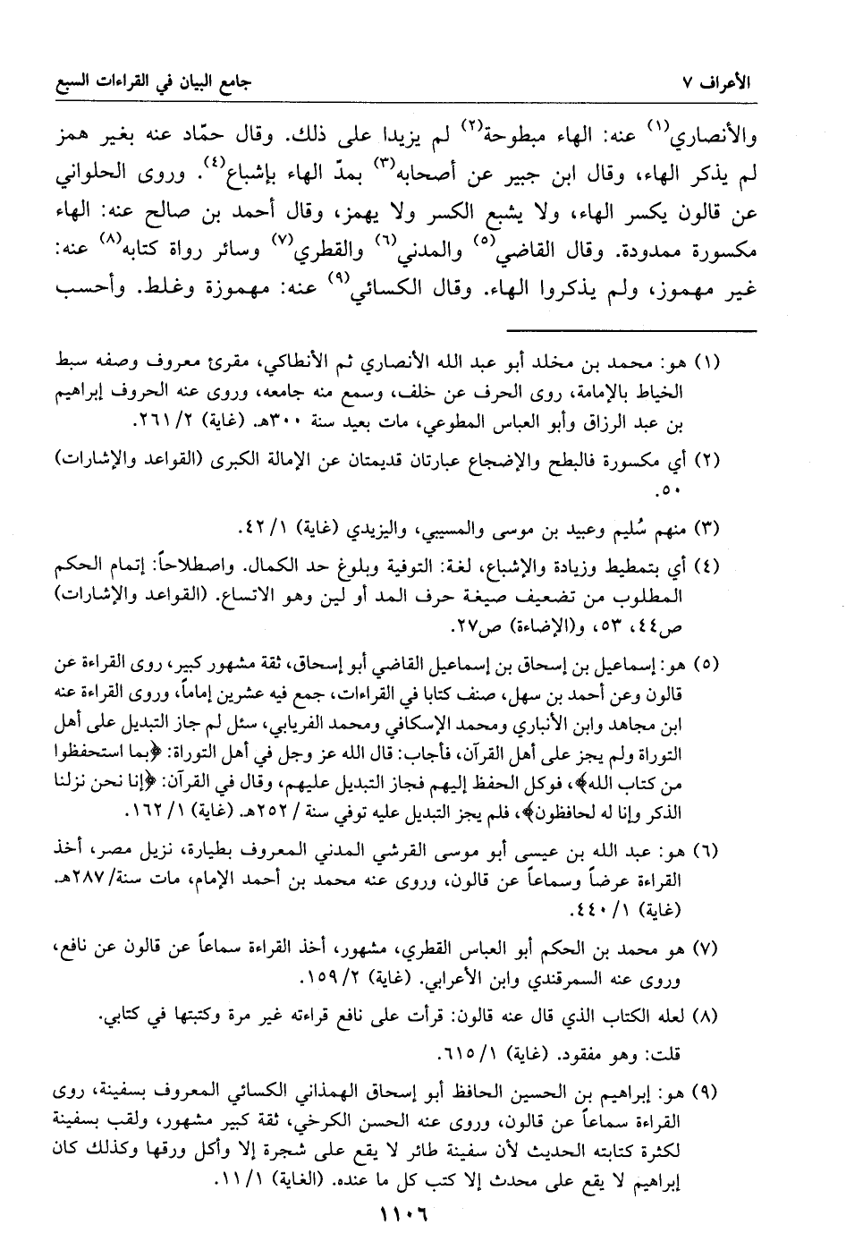 (7) هو محمد بن الحكم أبو العباس القطري، مشهور، أخذ القراءة سماعا عن قالون عن نافع، وروى عنه السمرقندي وابن الأعرابي. (غاية) 2/ 159.