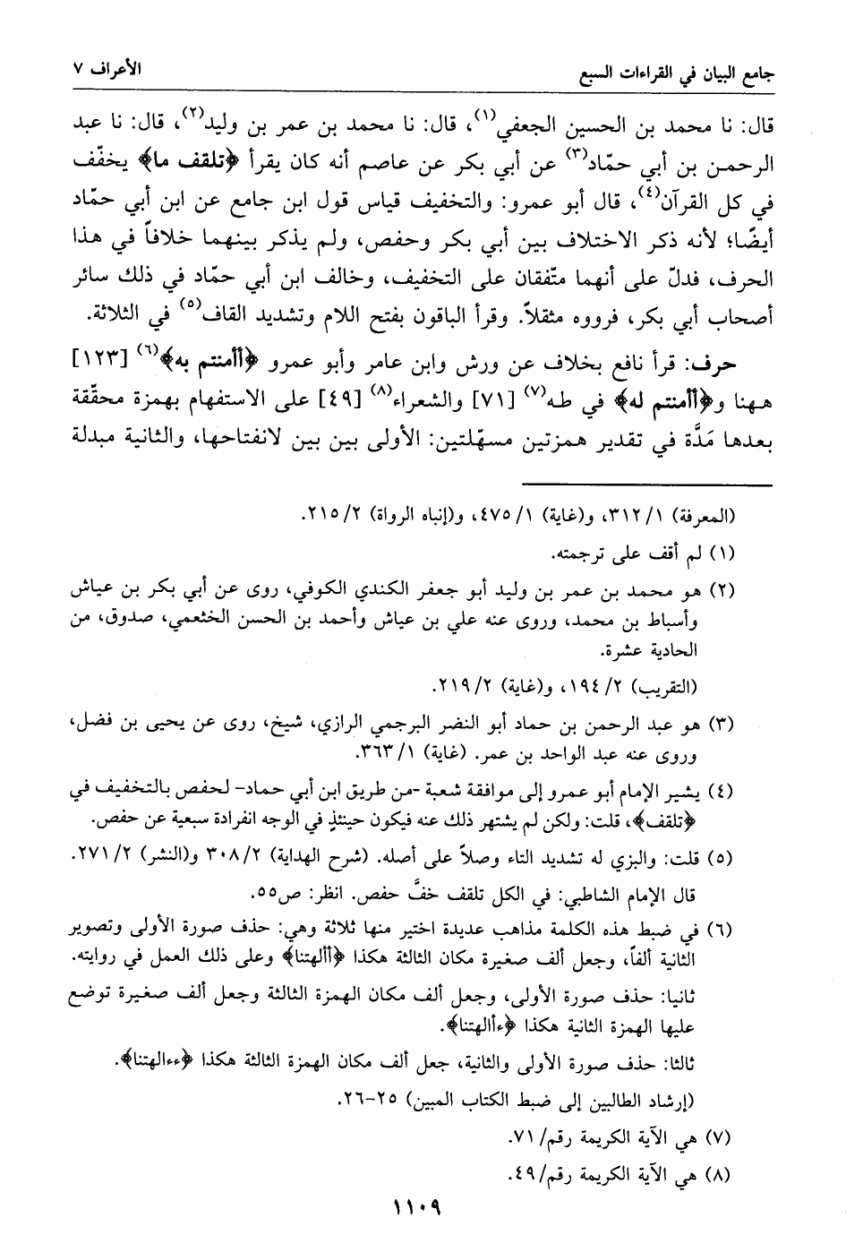 (6) في ضبط هذه الكلمة مذاهب عديدة اختير منها ثلاثة وهي: حذف صورة الأولى وتصوير الثانية ألفا، وجعل ألف صغيرة مكان الثالثة هكذا أألهتنا وعلى ذلك العمل في روايته.