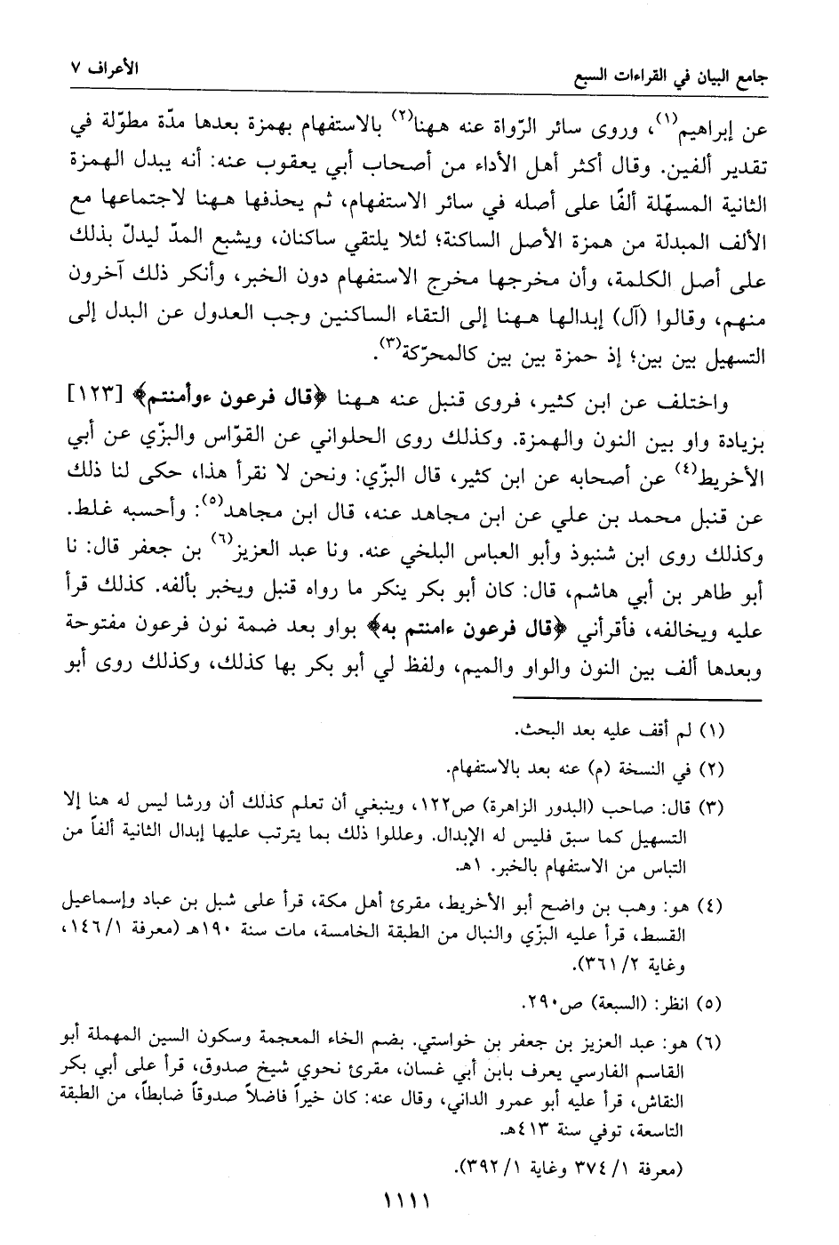 (6) هو: عبد العزيز بن جعفر بن خواستي. بضم الخاء المعجمة وسكون السين المهملة أبو القاسم الفارسي يعرف بابن أبي غسان، مقرئ نحوي شيخ صدوق، قرأ على أبي بكر النقاش، قرأ عليه أبو عمرو الداني، وقال عنه: كان خيرا فاضلا صدوقا ضابطا، من الطبقة التاسعة، توفي سنة 413 هـ.