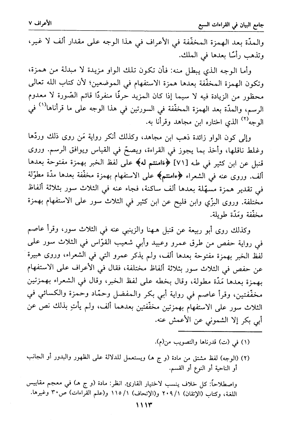 وإلى كون الواو زائدة ذهب ابن مجاهد، وكذلك أنكر رواية من روى ذلك وردّها وغلط ناقلها، وأخذ بما يجوز في القراءة، ويصحّ في القياس ويوافق الرسم. وروى قنبل عن ابن كثير في طه [71] ءامنتم له على لفظ الخبر بهمزة مفتوحة بعدها ألف. وروى عنه في الشعراء ءامنتم على الاستفهام بهمزة مخفّفة بعدها مدّة مطوّلة في تقدير همزة مسهّلة بعدها ألف ساكنة، فجاء عنه في الثلاث سور بثلاثة ألفاظ مختلفة. وروى البزّي وابن فليح عن ابن كثير في الثلاث سور على الاستفهام بهمزة مخفّفة ومدّة طويلة.