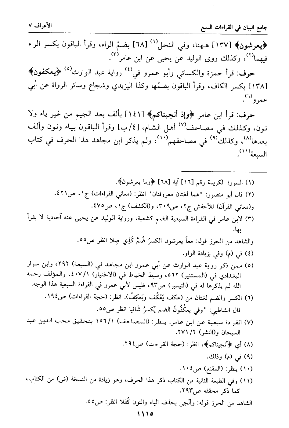 يعرشون [137] هاهنا، وفي النحل «1» [68] بضمّ الراء، وقرأ الباقون بكسر الراء فيهما «2»، وكذلك روى الوليد عن يحيى عن ابن عامر «3».