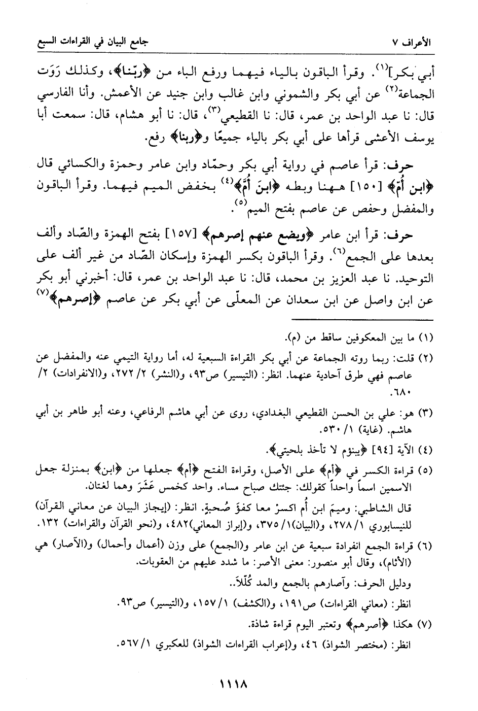 (6) قراءة الجمع انفرادة سبعية عن ابن عامر و (الجمع) على وزن (أعمال وأحمال) و (الآصار) هي (الآثام)، وقال أبو منصور: معنى الأصر: ما شدد عليهم من العقوبات.