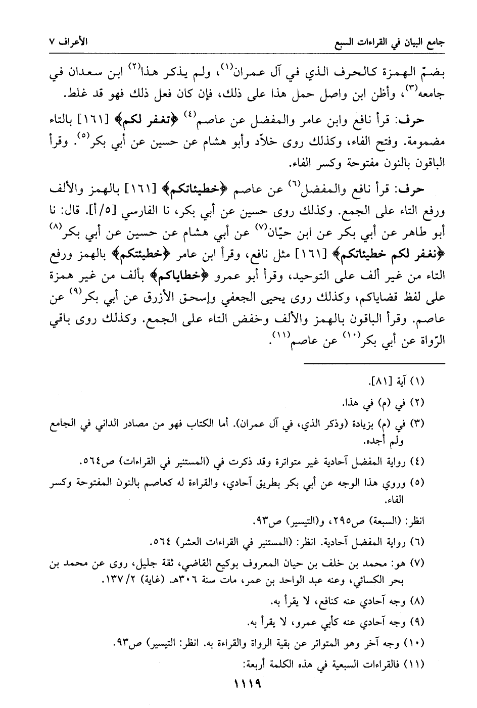 (3) في (م) بزيادة (وذكر الذي، في آل عمران). أما الكتاب فهو من مصادر الداني في الجامع ولم أجده.
