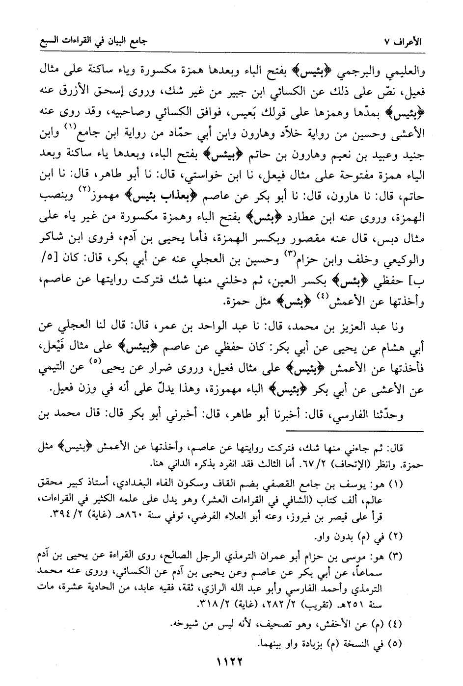 ونا عبد العزيز بن محمد، قال: نا عبد الواحد بن عمر، قال: قال لنا العجلي عن أبي هشام عن يحيى عن أبي بكر: كان حفظي عن عاصم بيئس على مثال فيعل، فأخذتها عن الأعمش بئيس على مثال فعيل، وروى ضرار عن يحيى «5» عن التيمي عن الأعشى عن أبي بكر بئيس الباء مهموزة، وهذا يدلّ على أنه في وزن فعيل.