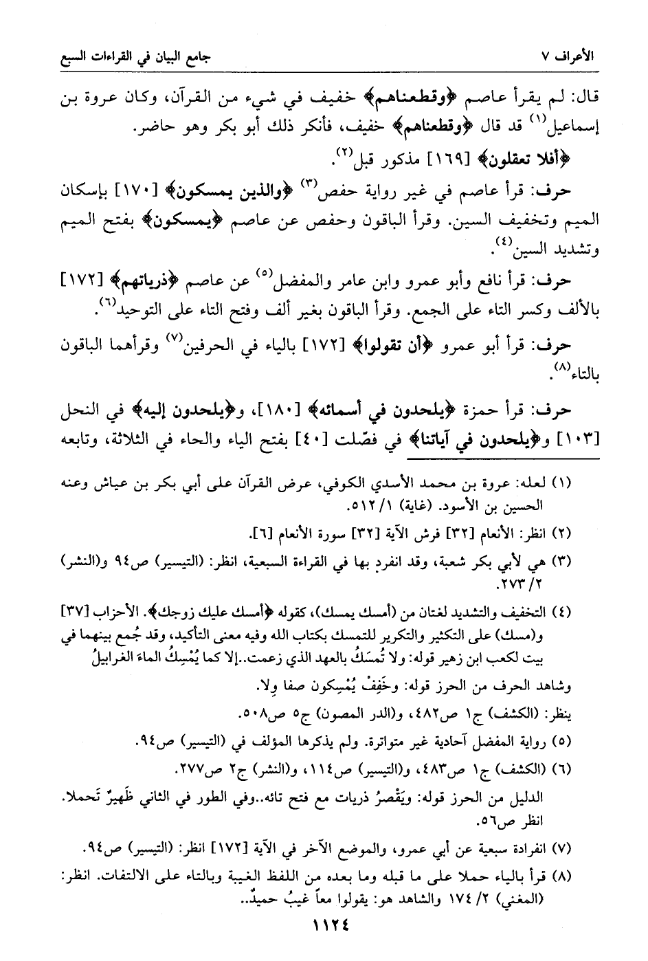 (7) انفرادة سبعية عن أبي عمرو، والموضع الآخر في الآية [172] انظر: (التيسير) ص 94.