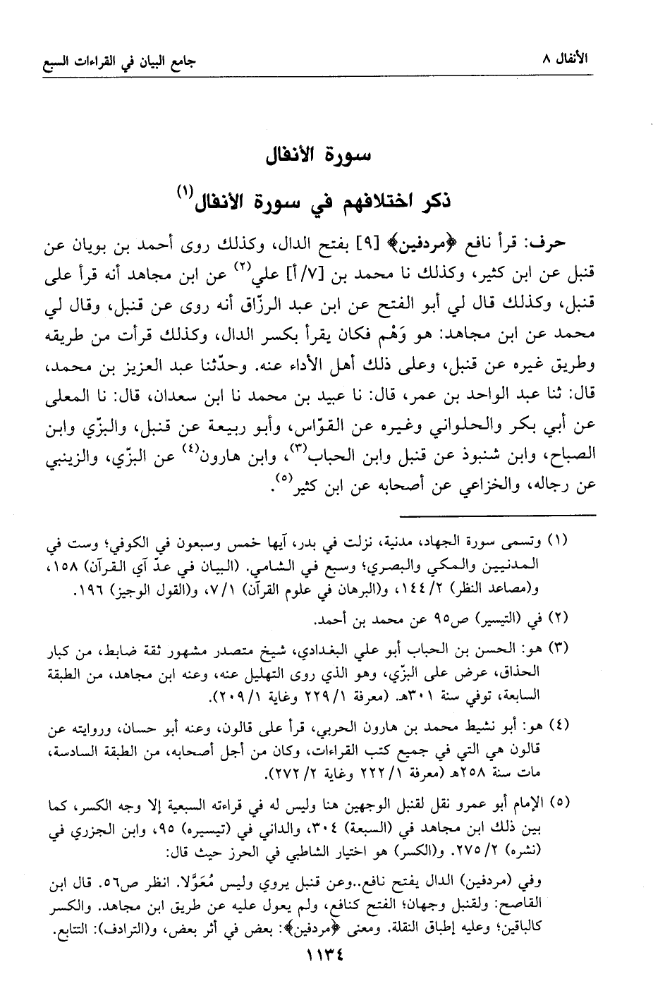 قرأ نافع مردفين [9] بفتح الدال، وكذلك روى أحمد بن بويان عن قنبل عن ابن كثير، وكذلك نا محمد بن [7/ أ] علي «2» عن ابن مجاهد أنه قرأ على قنبل، وكذلك قال لي أبو الفتح عن ابن عبد الرزّاق أنه روى عن قنبل، وقال لي محمد عن ابن مجاهد: هو وهم فكان يقرأ بكسر الدال، وكذلك قرأت من طريقه وطريق غيره عن قنبل، وعلى ذلك أهل الأداء عنه. وحدّثنا عبد العزيز بن محمد، قال: ثنا عبد الواحد بن عمر، قال: نا عبيد بن محمد نا ابن سعدان، قال: نا المعلى عن أبي بكر والحلواني وغيره عن القوّاس، وأبو ربيعة عن قنبل، والبزّي وابن الصباح، وابن شنبوذ عن قنبل وابن الحباب «3»، وابن هارون «4» عن البزّي، والزينبي عن رجاله، والخزاعي عن أصحابه عن ابن كثير «5».