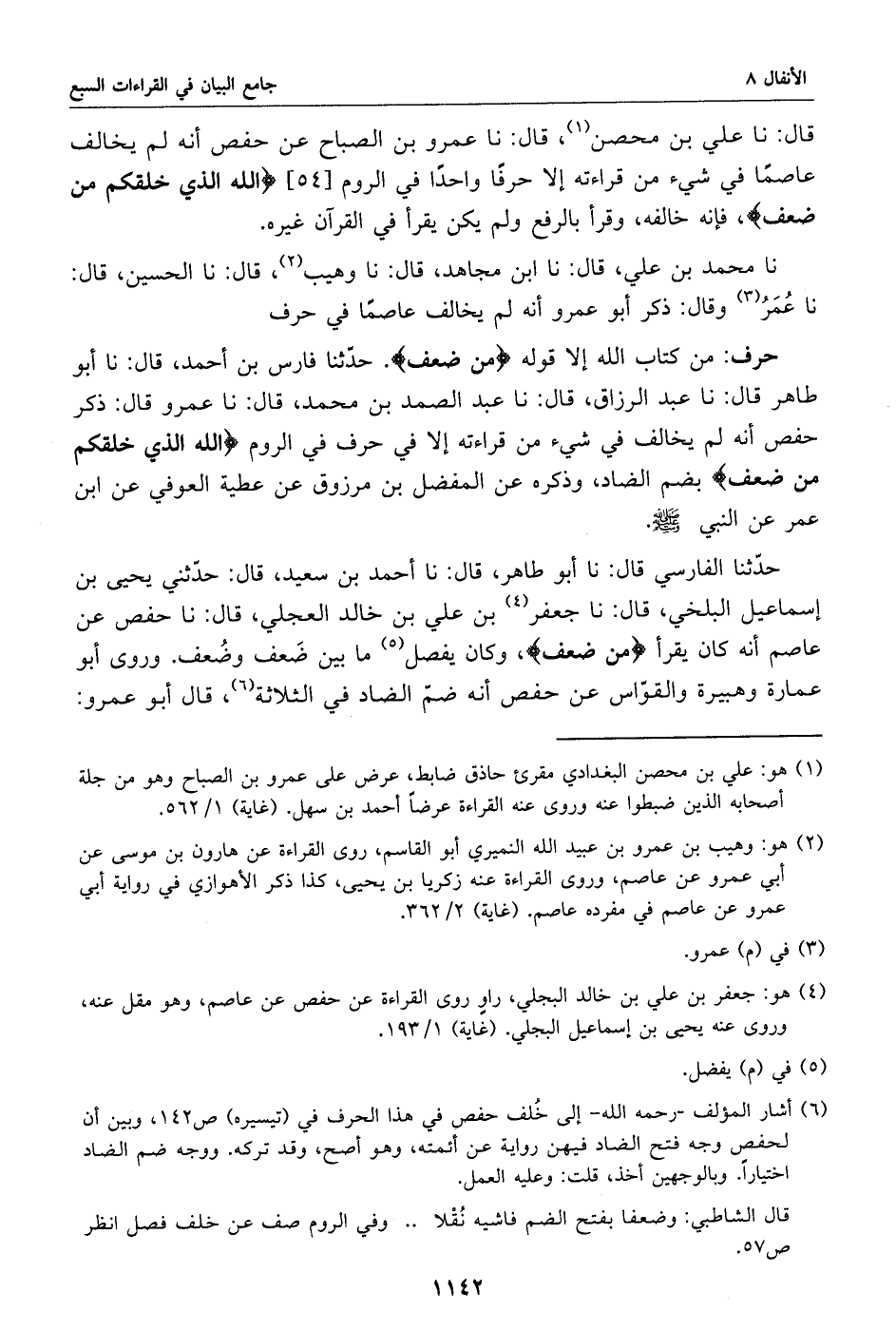 (4) هو: جعفر بن علي بن خالد البجلي، راو روى القراءة عن حفص عن عاصم، وهو مقل عنه، وروى عنه يحيى بن إسماعيل البجلي. (غاية) 1/ 193.