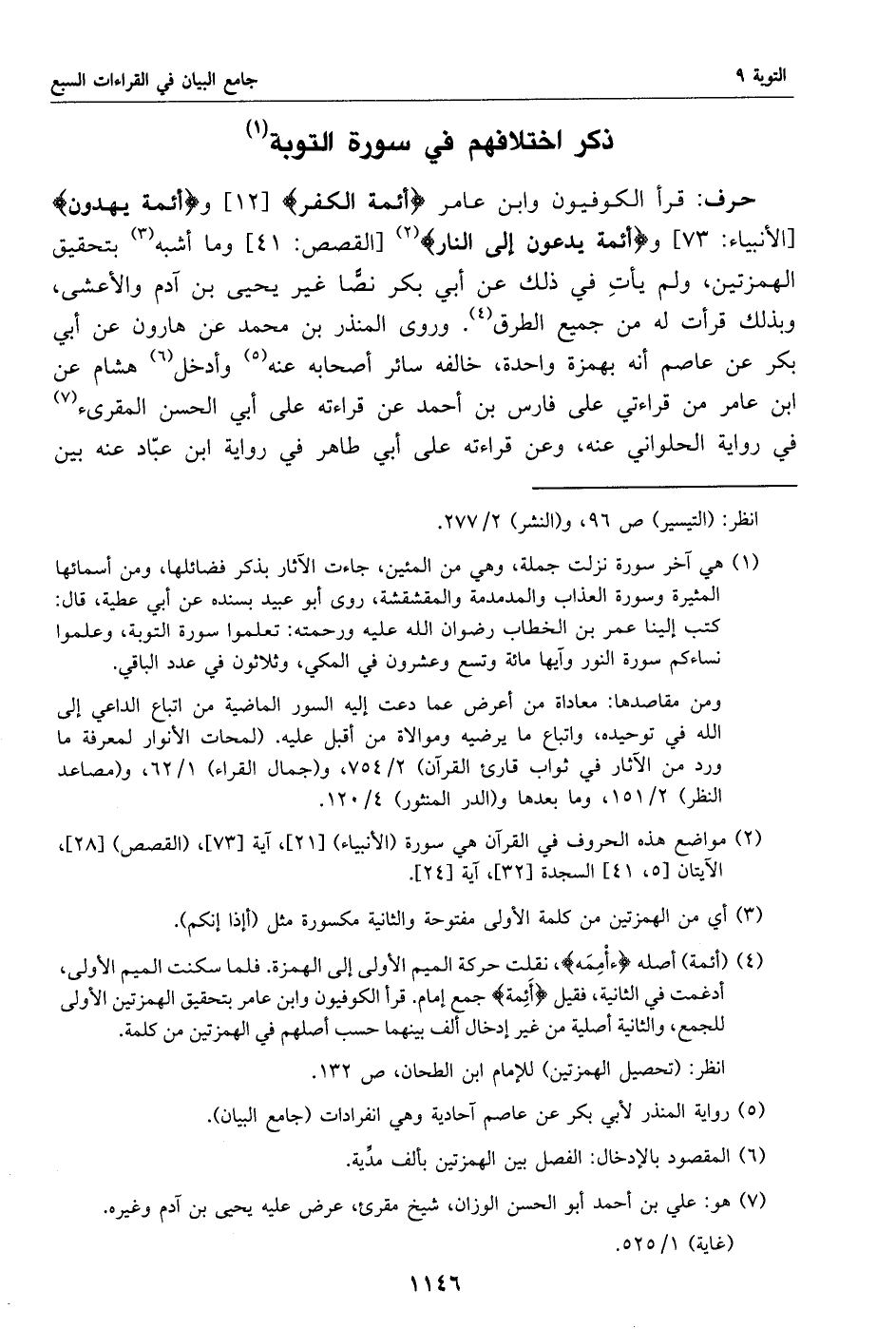 (4) (أئمة) أصله ءأممه، نقلت حركة الميم الأولى إلى الهمزة. فلما سكنت الميم الأولى، أدغمت في الثانية، فقيل أئمة جمع إمام. قرأ الكوفيون وابن عامر بتحقيق الهمزتين الأولى للجمع، والثانية أصلية من غير إدخال ألف بينهما حسب أصلهم في الهمزتين من كلمة.