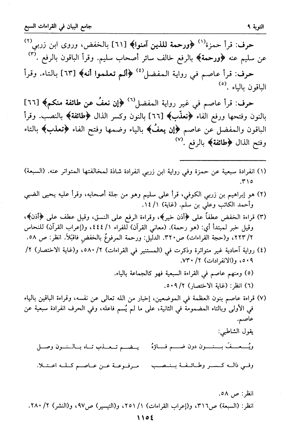 قرأ عاصم في غير رواية المفضل «6» إن نعف عن طائفة منكم [66] بالنون وفتحها ورفع الفاء نعذّب [66] بالنون وكسر الذال طائفة بالنصب. وقرأ الباقون والمفضل عن عاصم إن يعف بالياء وضمها وفتح الفاء تعذب بالتاء وفتح الذال طائفة بالرفع. «7»