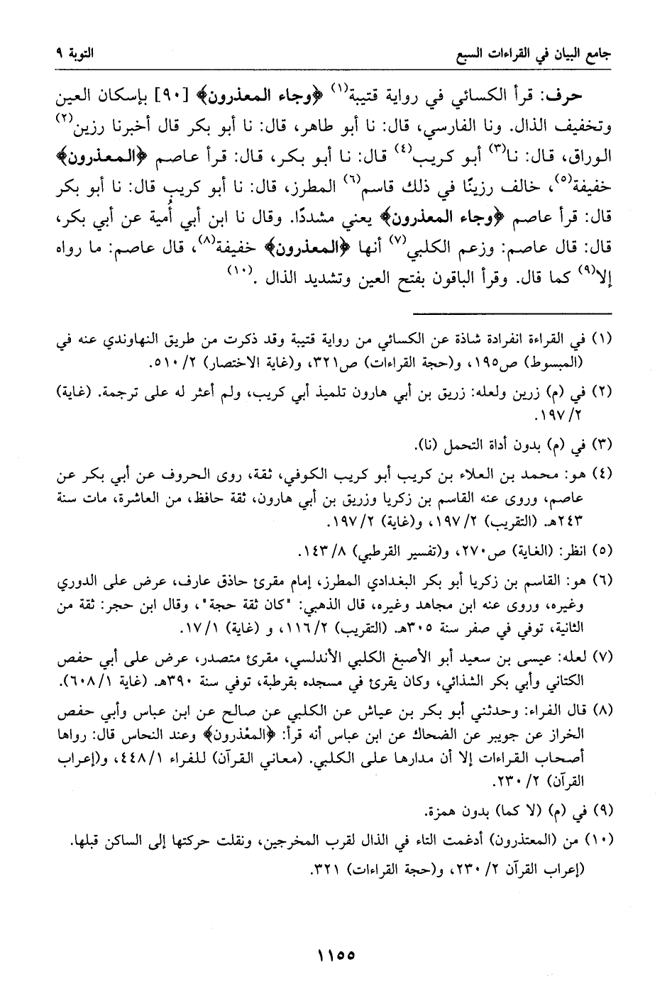(8) قال الفراء: وحدثني أبو بكر بن عياش عن الكلبي عن صالح عن ابن عباس وأبي حفص الخراز عن جويبر عن الضحاك عن ابن عباس أنه قرأ: المعذرون وعند النحاس قال: رواها أصحاب القراءات إلا أن مدارها على الكلبي. (معاني القرآن) للفراء 1/ 448، و (إعراب القرآن) 2/ 230.