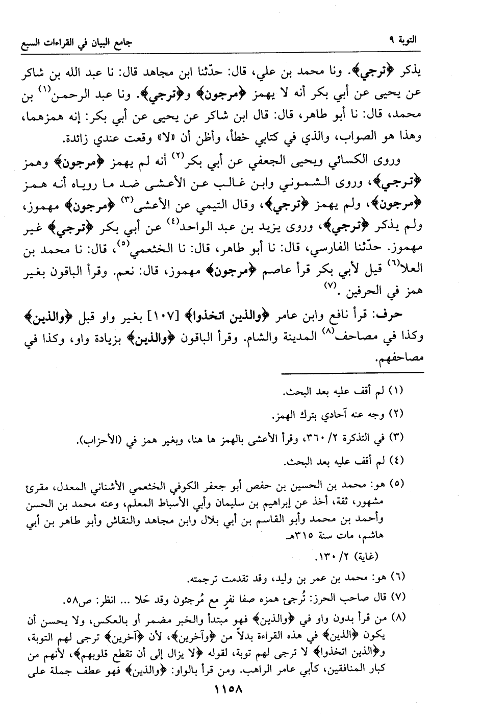(8) من قرأ بدون واو في والذين فهو مبتدأ والخبر مضمر أو بالعكس، ولا يحسن أن يكون الذين في هذه القراءة بدلا من وآخرين، لأن آخرين ترجى لهم التوبة، والذين اتخذوا لا ترجى لهم توبة، لقوله لا يزال إلى أن تقطع قلوبهم، لأنهم من كبار المنافقين، كأبي عامر الراهب. ومن قرأ بالواو: والذين فهو عطف جملة على