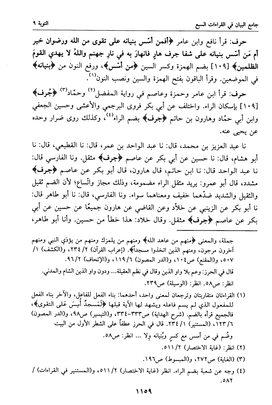 (1) القراءتان متقاربتان وترجعان لمعنى واحد، أحدهما: بناء الفعل للفاعل، والآخر بناء الفعل للمفعول الذي لم يسم فاعله ويشهد لها الآية قبلها لمسجد أسس على التقوى، فالجميع قرأه بالضم. (شرح الهداية) ص 333 - 334، و (التيسير) ص 98، و (الدر المصون) 6/ 123، (المستنير) 1/ 234. قال في الحرز عطفا على الشطر الأول من البيت وضم في من أسس مع كسر وبنيانه ولا ... انظر: ص 58.