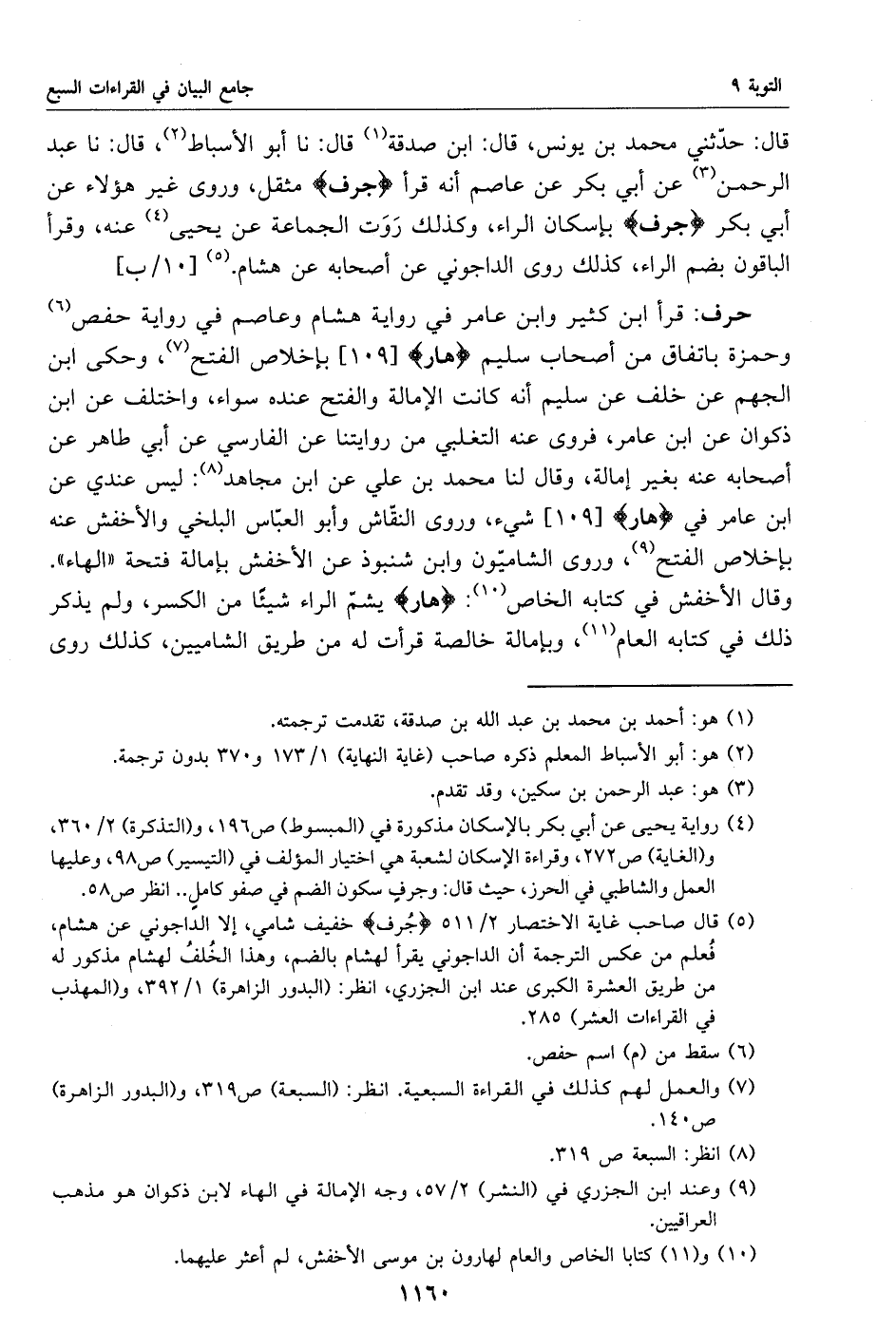 (5) قال صاحب غاية الاختصار 2/ 511 جرف خفيف شامي، إلا الداجوني عن هشام، فعلم من عكس الترجمة أن الداجوني يقرأ لهشام بالضم، وهذا الخلف لهشام مذكور له من طريق العشرة الكبرى عند ابن الجزري، انظر: (البدور الزاهرة) 1/ 392، و (المهذب في القراءات العشر) 285.