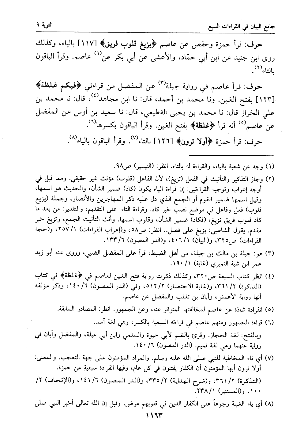قرأ حمزة وحفص عن عاصم يزيغ قلوب فريق [117] بالياء، وكذلك روى ابن جنيد عن ابن أبي حمّاد، والأعشى عن أبي بكر عن «1» عاصم. وقرأ الباقون بالتاء «2».