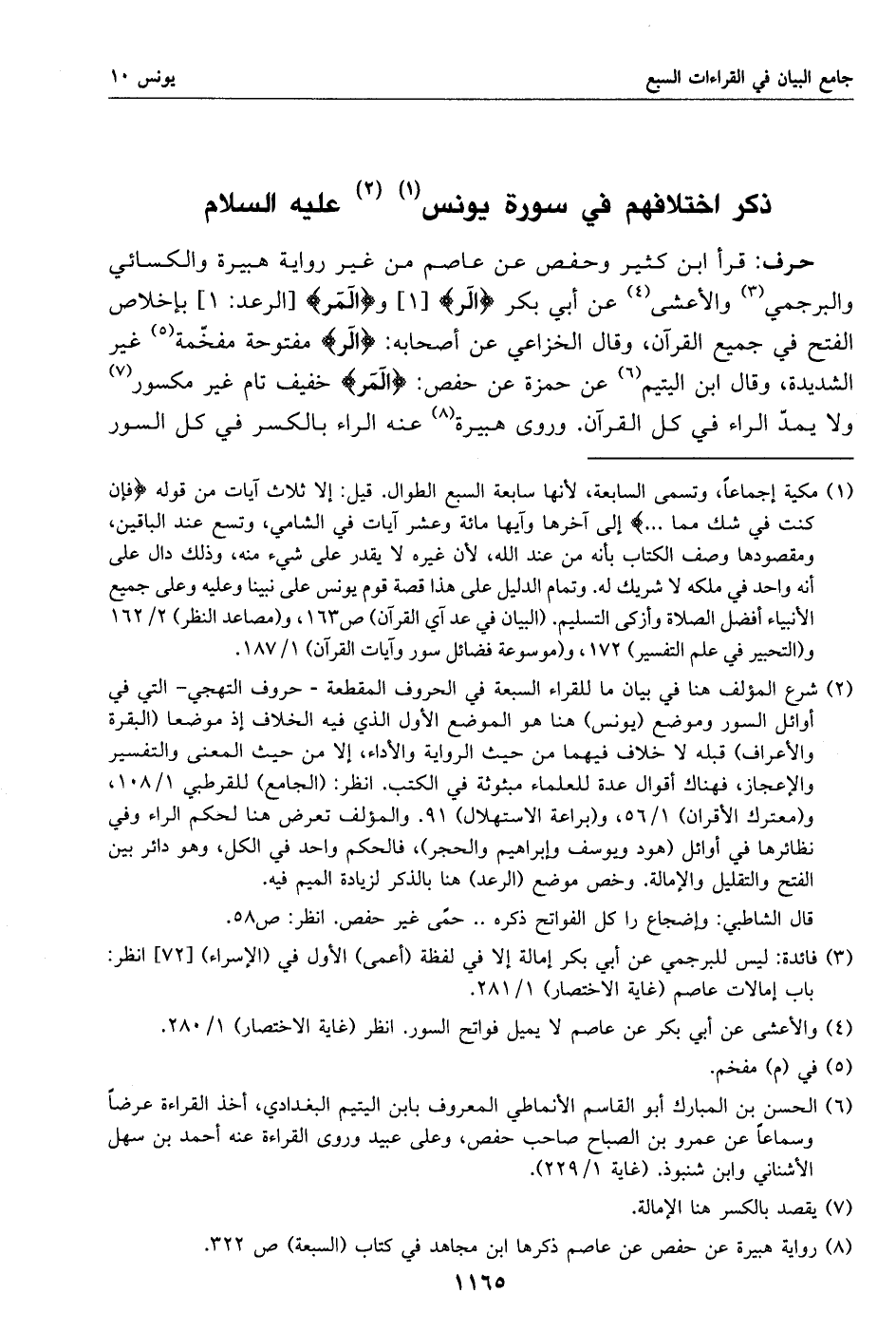 (2) شرع المؤلف هنا في بيان ما للقراء السبعة في الحروف المقطعة- حروف التهجي- التي في أوائل السور وموضع (يونس) هنا هو الموضع الأول الذي فيه الخلاف إذ موضعا (البقرة والأعراف) قبله لا خلاف فيهما من حيث الرواية والأداء، إلا من حيث المعنى والتفسير والإعجاز، فهناك أقوال عدة للعلماء مبثوثة في الكتب. انظر: (الجامع) للقرطبي 1/ 108، و (معترك الأقران) 1/ 56، و (براعة الاستهلال) 91. والمؤلف تعرض هنا لحكم الراء وفي نظائرها في أوائل (هود ويوسف وإبراهيم والحجر)، فالحكم واحد في الكل، وهو دائر بين الفتح والتقليل والإمالة. وخص موضع (الرعد) هنا بالذكر لزيادة الميم فيه.