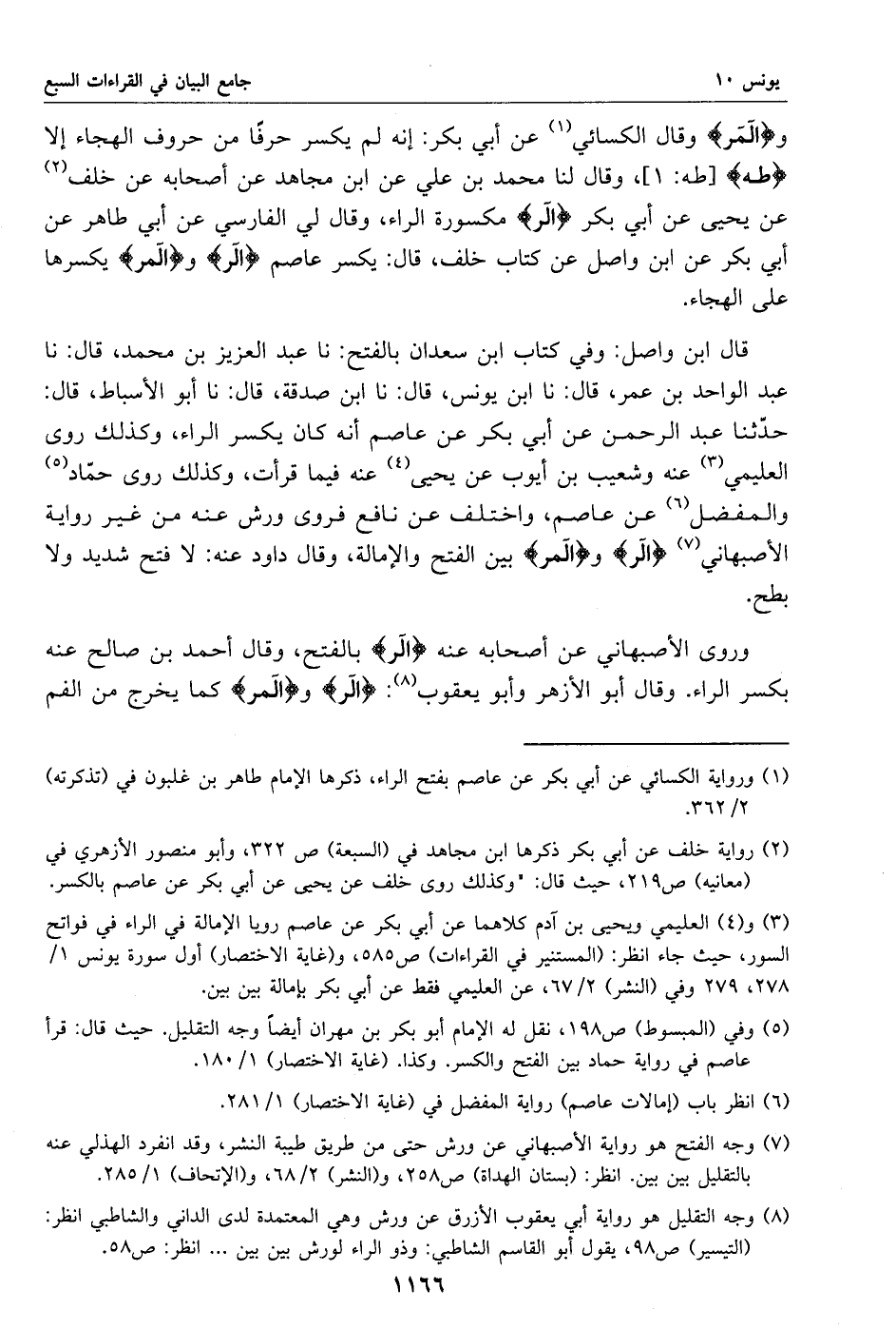 (3) و (4) العليمي ويحيى بن آدم كلاهما عن أبي بكر عن عاصم رويا الإمالة في الراء في فواتح السور، حيث جاء انظر: (المستنير في القراءات) ص 585، و (غاية الاختصار) أول سورة يونس 1/ 278، 279 وفي (النشر) 2/ 67، عن العليمي فقط عن أبي بكر بإمالة بين بين.
