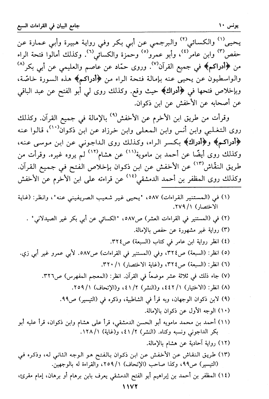 يحيى «1» والكسائي «2» والبرجمي عن أبي بكر وفي رواية هبيرة وأبي عمارة عن حفص «3» وابن عامر «4»، وأبو عمرو «5» وحمزة والكسائي «6». وكذلك أمالوا فتحة الراء من أدراكم في جميع القرآن «7». وروى حمّاد عن عاصم والعليمي عن أبي بكر «8» والواسطيون عن يحيى عنه بإمالة فتحة الراء من أدراكم هذه السورة خاصّة، وبإخلاص فتحها في أدراك حيث وقع. وكذلك روى لي أبو الفتح عن عبد الباقي عن أصحابه عن الأخفش عن ابن ذكوان.