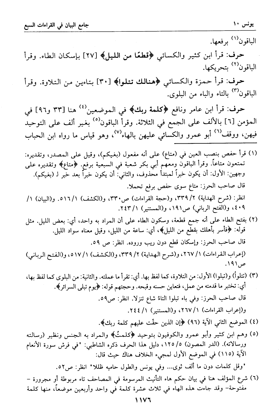 (5) وهم ابن كثير وأبو عمرو والكوفيون بتوحيد كلمت والمراد به الجنس ونظير (رسالته ورسالاته). (الدر المصون) 5/ 125، دليل هذا الحرف ذكره الشاطبي:" في فرش سورة الأنعام الآية (115) في الموضع الأول لمجيء الخلاف هناك حيث قال: