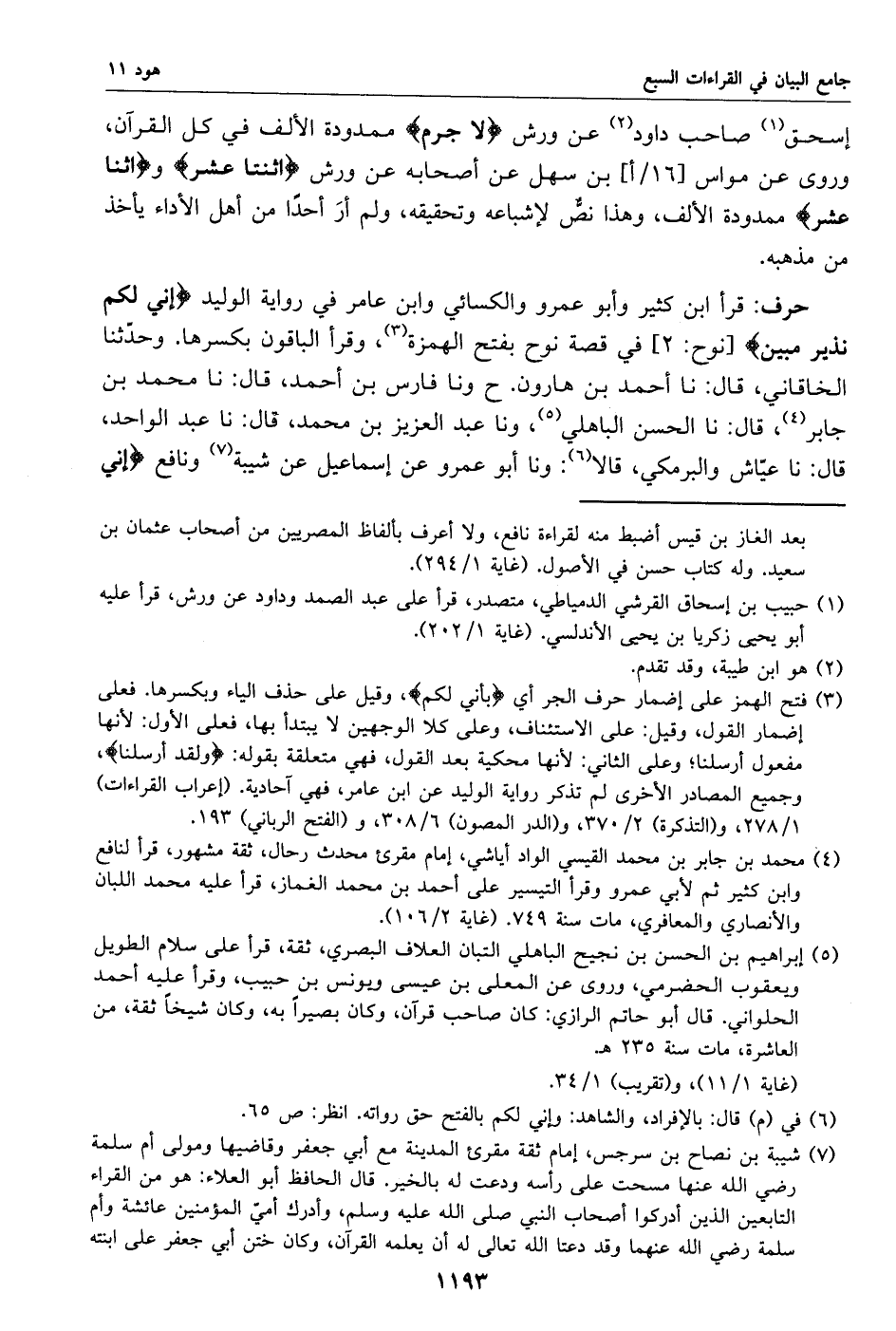 قرأ ابن كثير وأبو عمرو والكسائي وابن عامر في رواية الوليد إني لكم نذير مبين [نوح: 2] في قصة نوح بفتح الهمزة «3»، وقرأ الباقون بكسرها. وحدّثنا الخاقاني، قال: نا أحمد بن هارون. ح ونا فارس بن أحمد، قال: نا محمد بن جابر «4»، قال: نا الحسن الباهلي «5»، ونا عبد العزيز بن محمد، قال: نا عبد الواحد، قال: نا عيّاش والبرمكي، قالا «6»: ونا أبو عمرو عن إسماعيل عن شيبة «7» ونافع إني