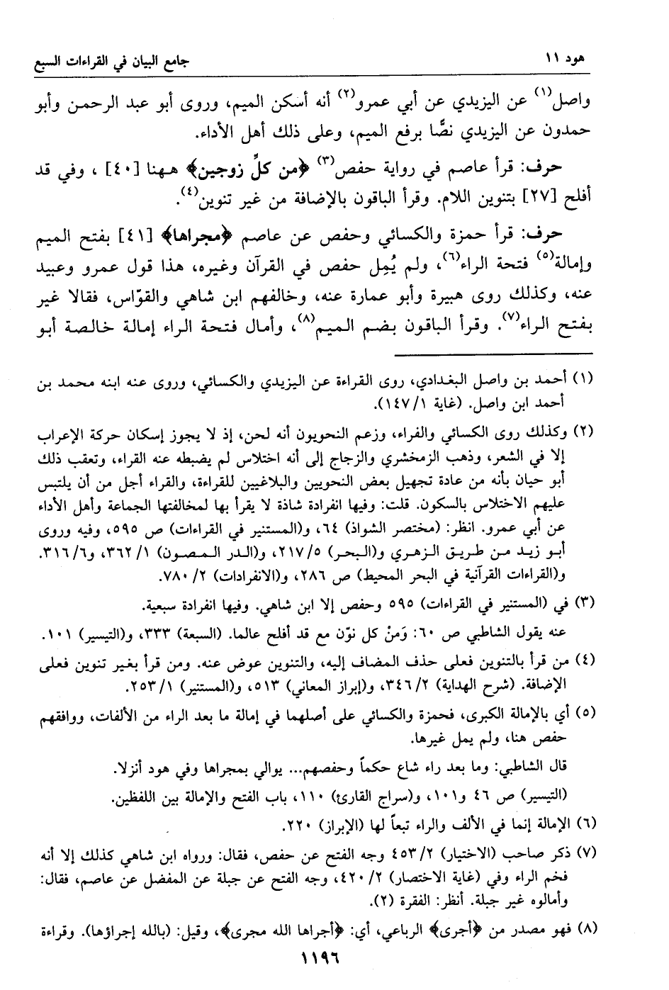 قرأ حمزة والكسائي وحفص عن عاصم مجراها [41] بفتح الميم وإمالة «5» فتحة الراء «6»، ولم يمل حفص في القرآن وغيره، هذا قول عمرو وعبيد عنه، وكذلك روى هبيرة وأبو عمارة عنه، وخالفهم ابن شاهي والقوّاس، فقالا غير بفتح الراء «7». وقرأ الباقون بضم الميم «8»، وأمال فتحة الراء إمالة خالصة أبو