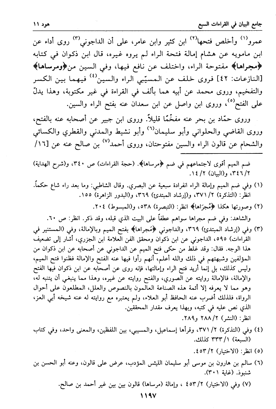 (3) وفي (إرشاد المبتدئ) 369، والداجوني مجراها بفتح الميم وبالإمالة، وفي (المستنير في القراءات) 595، الداجوني عن ابن ذكوان ومحقق الفن العلامة ابن الجزري، أشار إلى تضعيف هذا الوجه. فقال: وقد غلط من حكى فتح الميم عن الداجوني عن أصحابه عن ابن ذكوان من المؤلفين وشبهتهم في ذلك والله أعلم، أنهم رأوا فيها عنه الفتح والإمالة فظنوا فتح الميم، وليس كذلك، بل إنما أريد فتح الراء وإمالتها، فإنه روى عن أصحابه عن ابن ذكوان فيها الفتح والإمالة، فالإمالة روايته عن الصوري، والفتح روايته عن غيره، وهذا مما ينبغي أن يتنبه له، وهو مما لا يعرفه إلا أئمة هذه الصناعة العالمون بالنصوص والعلل، المطلعون على أحوال الرواة، فلذلك أضرب عنه الحافظ أبو العلاء، ولم يعتبره مع روايته له عنه شيخه أبي العز، الذي نص عليه في كتبه، وبهذا يعرف مقدار المحققين.